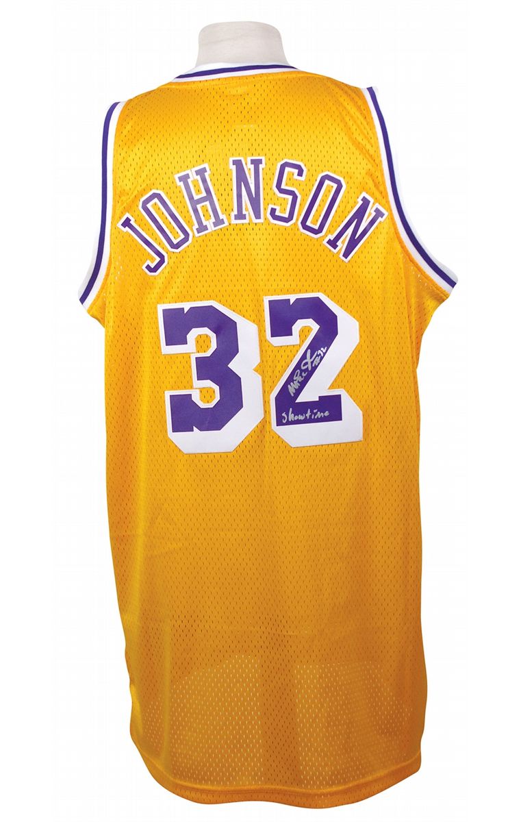 Official Adidas replica Los Angeles Lakers basketball jersey, with sewn on letters and numbers, signed in silver ink on the number on the back, “Magic Johnson #32 Showtime.” In very fine condition.