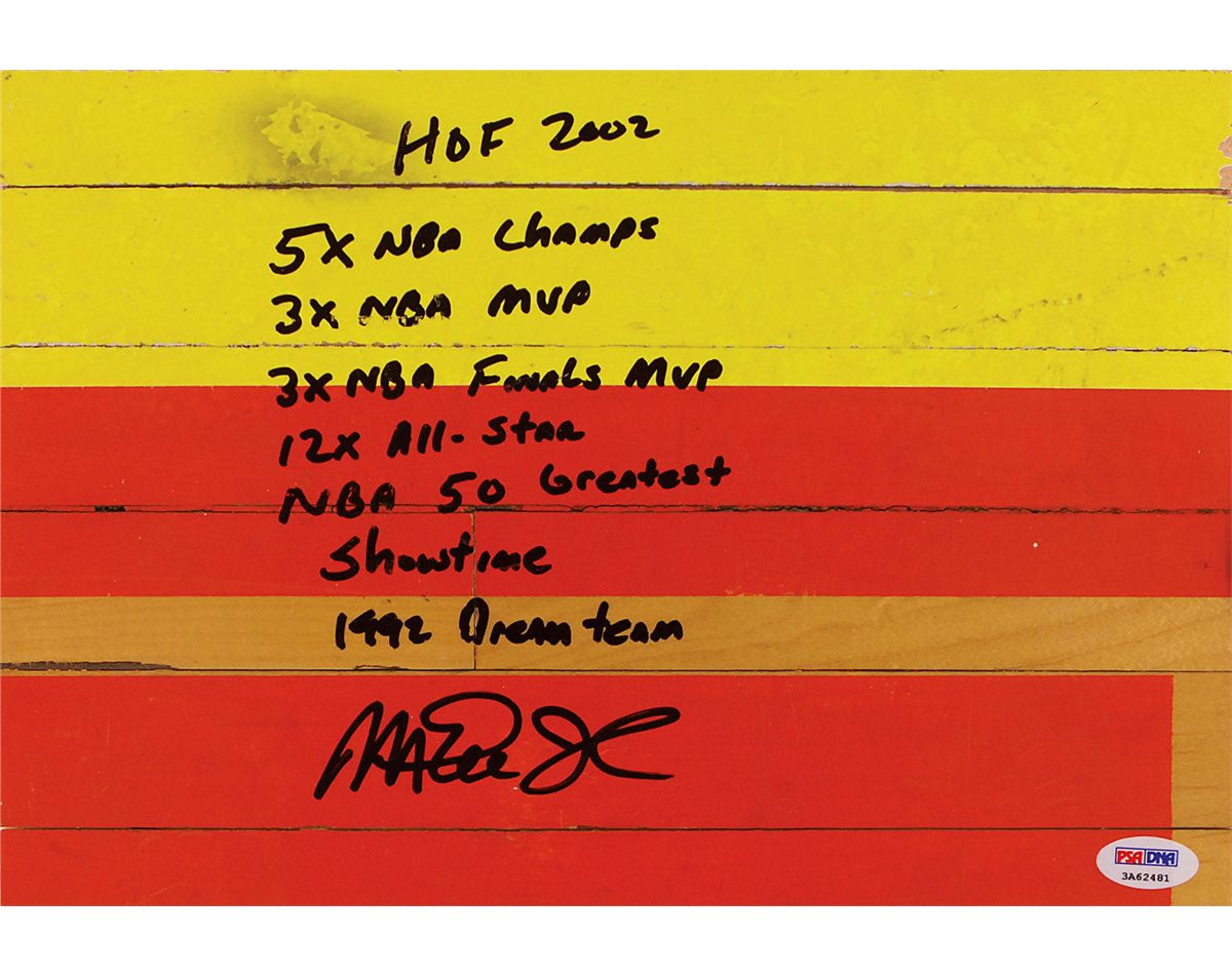 Large section of yellow and orange basketball floorboard,12 x 8 x 1.25, signed in black felt tip by Johnson, adding many of his career stats and achievements: “HOF 2002, 5x NBA Champs, 3x NBA MVP, 3x NBA Finals MVP, 12x All-Star, NBA 50 Greatest, Showtime, 1992 Dream Team.” In fine condition.