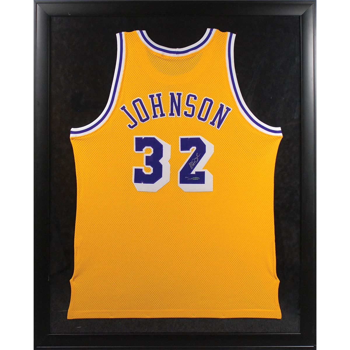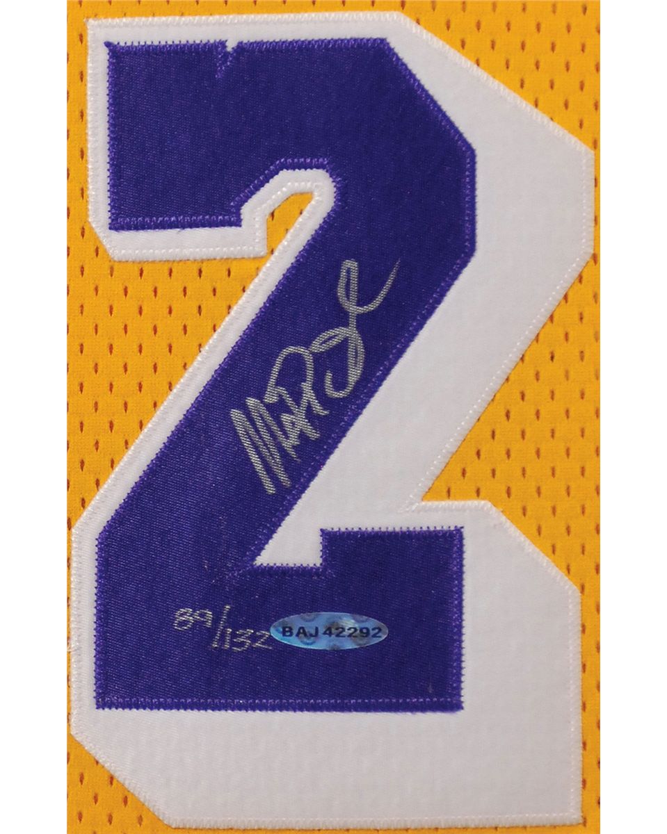 Limited edition replica Los Angeles Lakers basketball jersey, with sewn on letters and numbers, numbered 89/132, signed in silver ink on the number on the back. Framed to an overall size of 35.25 x 43.5. In very fine condition, with an Upper Deck hologram affixed to number. Accompanied by a certificate of authenticity from Upper Deck. Oversized.