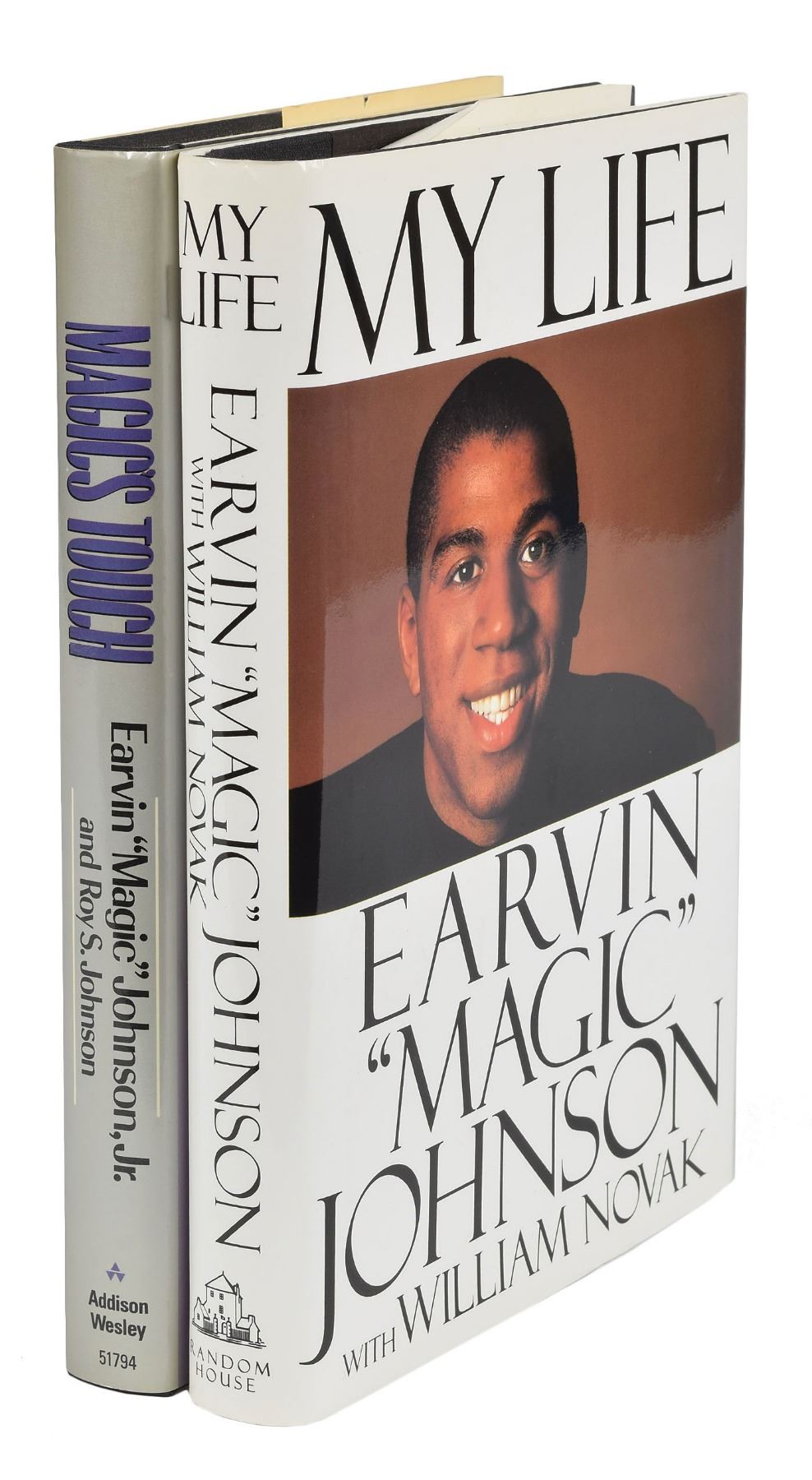 Two first edition books, both hardcover with dust jacket, signed inside on the title page in ink, "Earvin Magic Johnson." In overall fine condition. My Life book accompanied by a photo of Johnson taken at a Barnes & Noble book signing.