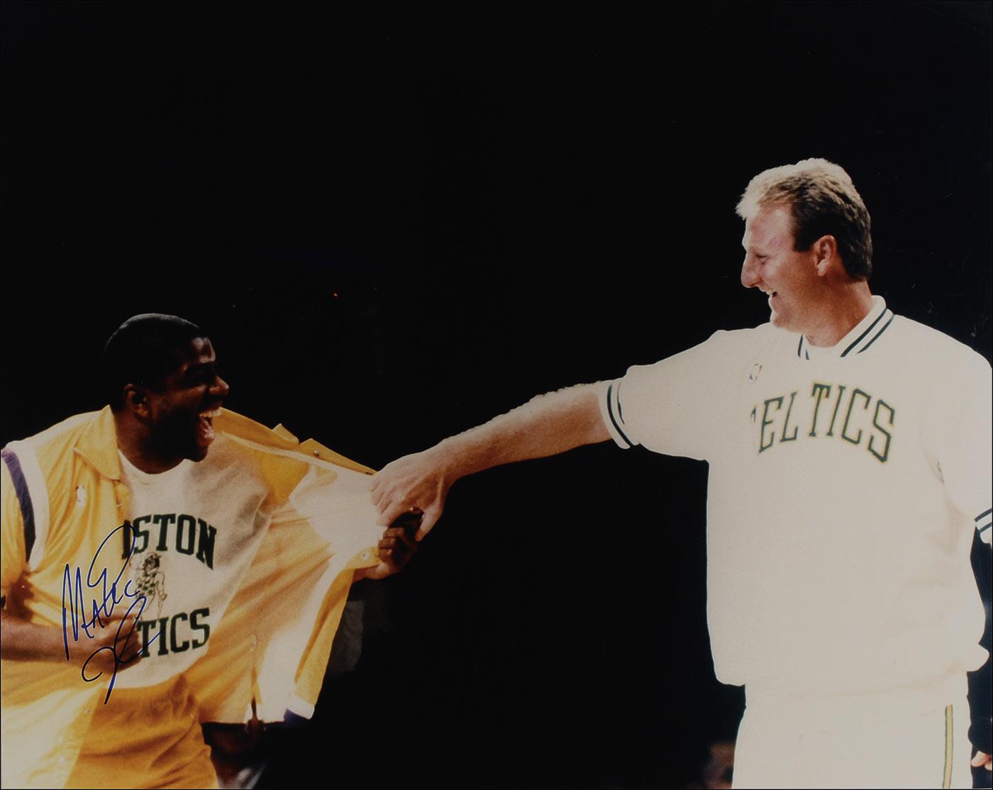 Color glossy 20 x 16 photo of Johnson surprising Larry Bird by wearing a Celtics jersey, signed in blue felt tip by Johnson. In very fine condition. Pre-certified Steve Grad/PSA/DNA and RRAuction COA.