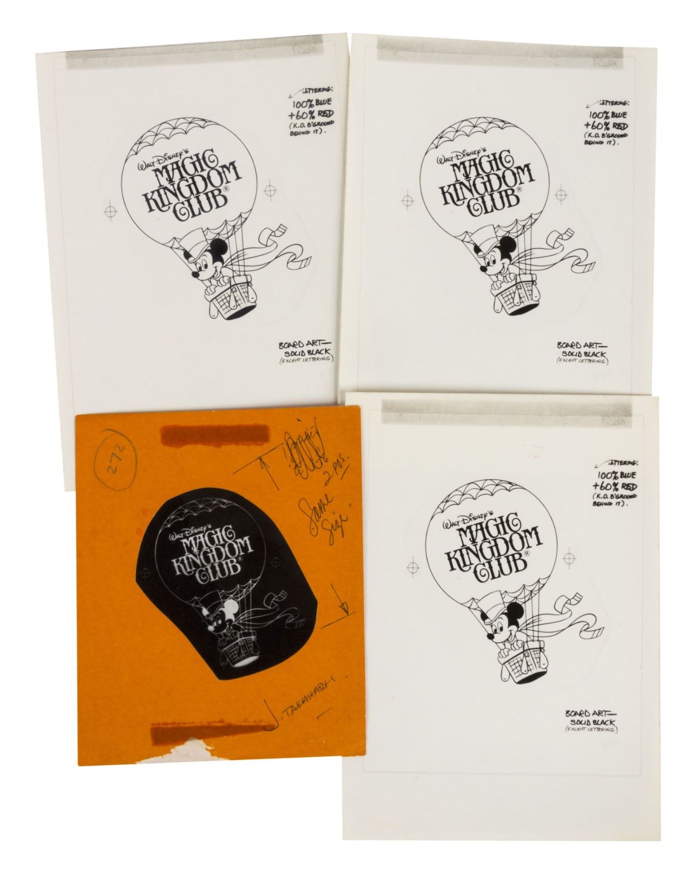 (Disneyland, 1970s) A grouping of artwork used to promote Disneyland's Magic Kingdom Club in the mid-to-late 1970s. This set includes matching imagery of Mickey Mouse in a hot air balloon, and includes (2) layered color separations, (1) negative cel layer, and (3) matching photostat images. The color separations feature several layers on artist's board and include notes to help depict which colors are to be used in which areas of the illustration. One of the color separation boards is marked "Pg. 18, 21" in reference to its use in a 1978 issue of "Disney News" magazine. This set ranges in size from the 5.5"x4.5" negative cel layer to the 12"x8" color separation board. The set is in very good condition with some expected wear from use.