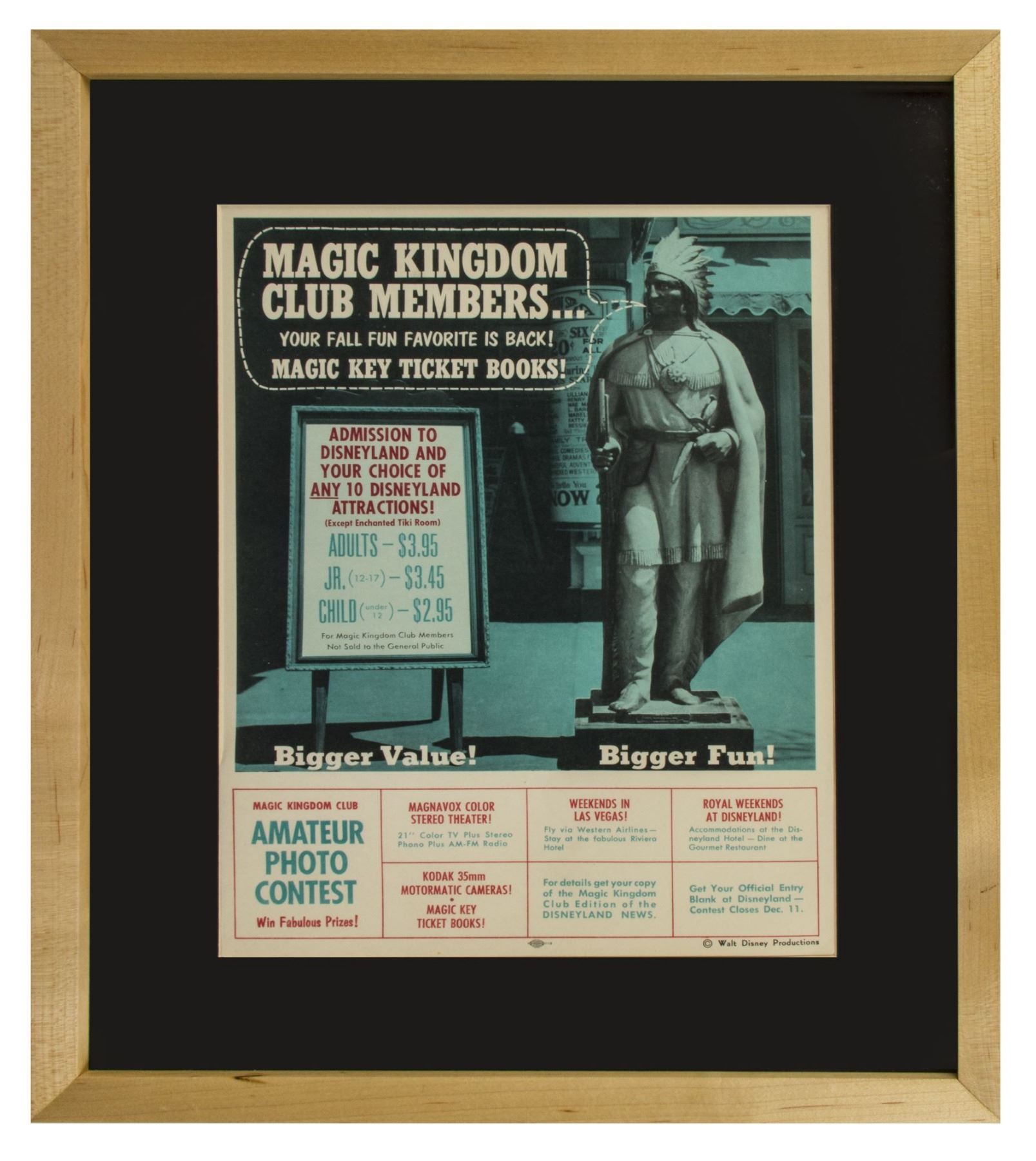 (Disneyland, c.1963) A very rare poster featuring Disneyland's Cigar Store Indian which was used to promote Magic Key ticket books for members of the Magic Kingdom Club. The poster features the prices for the ticket books and along the bottom of the poster, a Magic Kingdom Club amateur photo contest is announced with prizes including a 21" color tv and Kodak 35mm cameras. The poster has an image size of 12"x9" within its 17"x14" frame. The condition is very good.