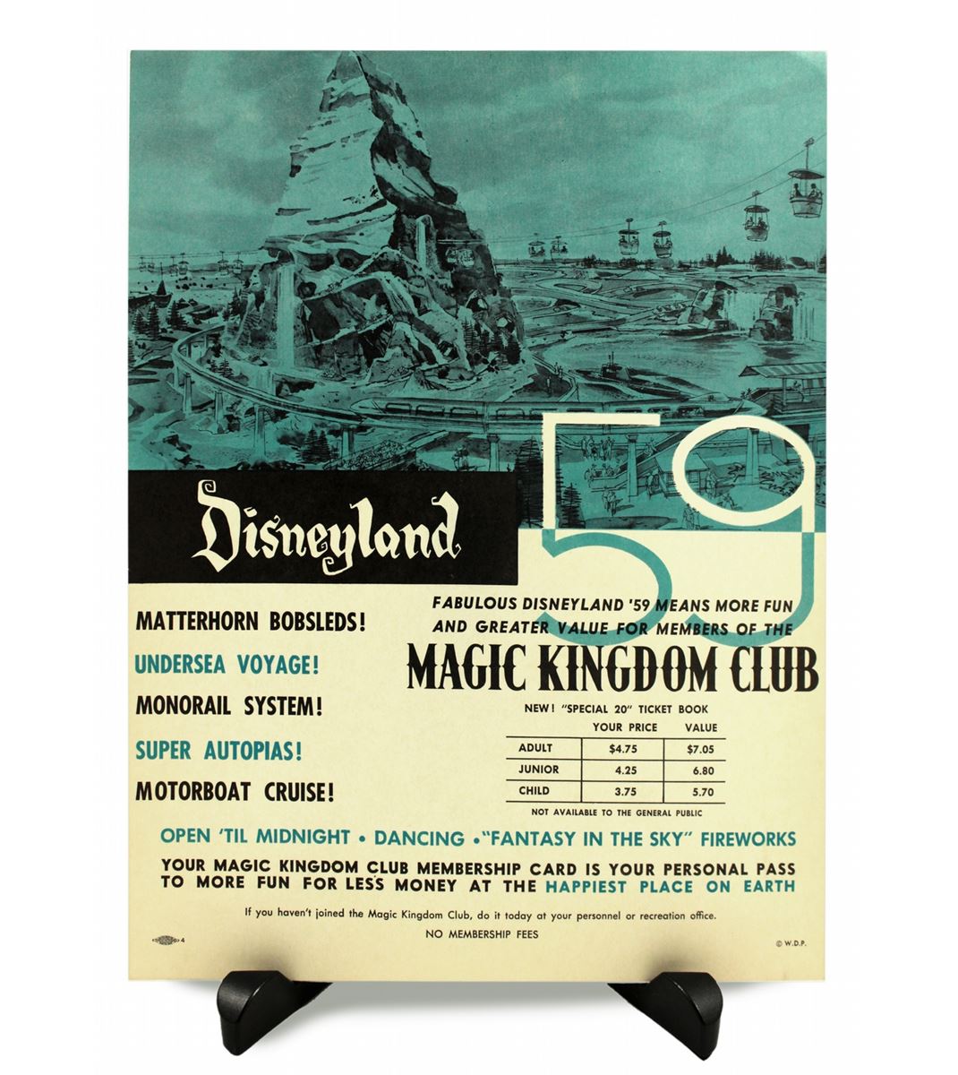 (Disneyland, 1959) Main Gate ticket booth poster for the Summer of 1959 featuring images of the new attractions. Measuring 10 x 8.5 in. and in very good condition.
