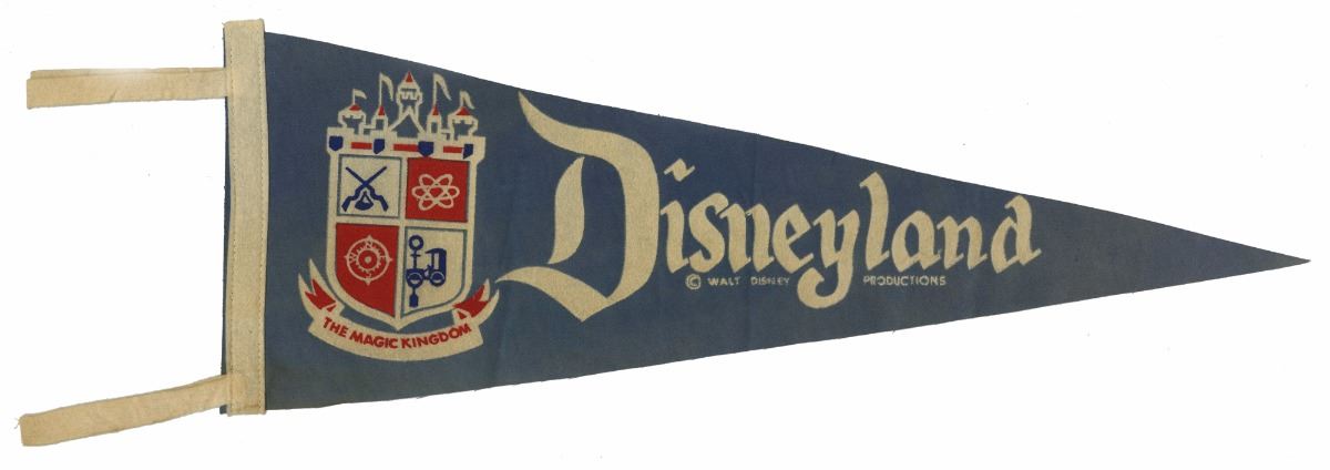 (Disneyland, 1950s) Light blue pennant with off-white lettering and The Magic Kingdom crest imagery. Measures 8.75"x23.5". In good condition with minor wear.