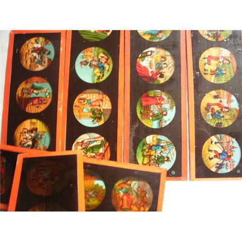 </font></strong>Six magic lantern glass slides representing stories, that I don't know, including a half story of the cat with the boots.