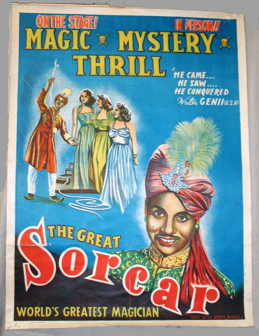 Magic Poster - Sorcar - Magic, Mystery, Thrill. Linen backed. Lithographic print by ASPY Litho Works, Madras 2. Marked on left bottom corner L, BY. V.S. Jaram. Overall dimensions approx. 40" x 29" W. Great condition.