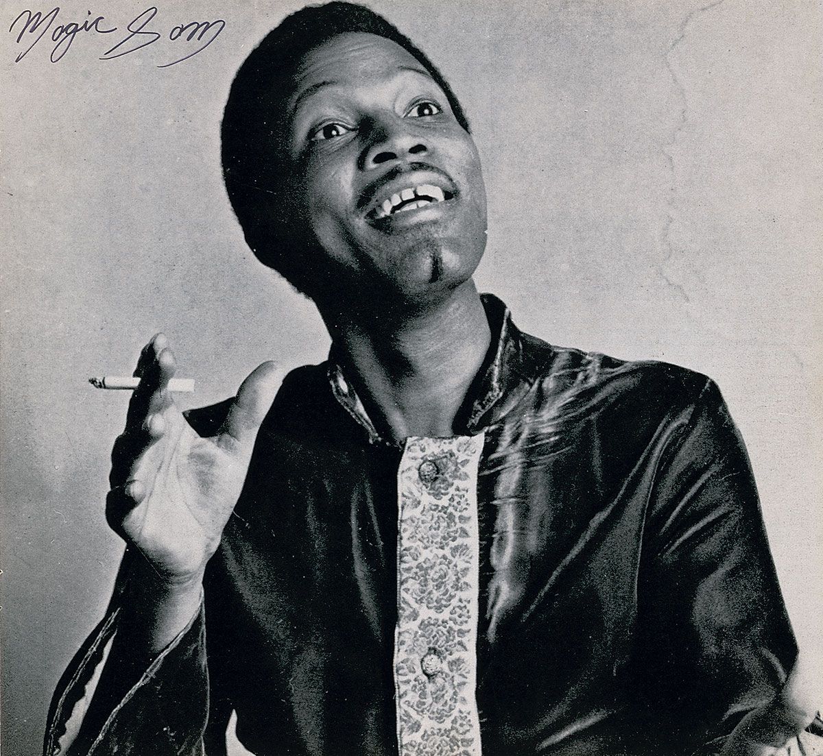 Blues guitarist and singer (1937-1969) whose career and confidence were undermined after serving a six-month sentence for desertion from the army. Program from the 1969 American Blues Festival, 11 x 10, signed inside in black felt tip on his full page image, “Magic Sam.” Program is also signed in ink and felt tip by Juke-Boy Bonner, Clifton Chenier, John Jackson, Alex Moore, Carey Bell, and Earl Hooker. In fine condition, with some scattered light creases and handling wear.