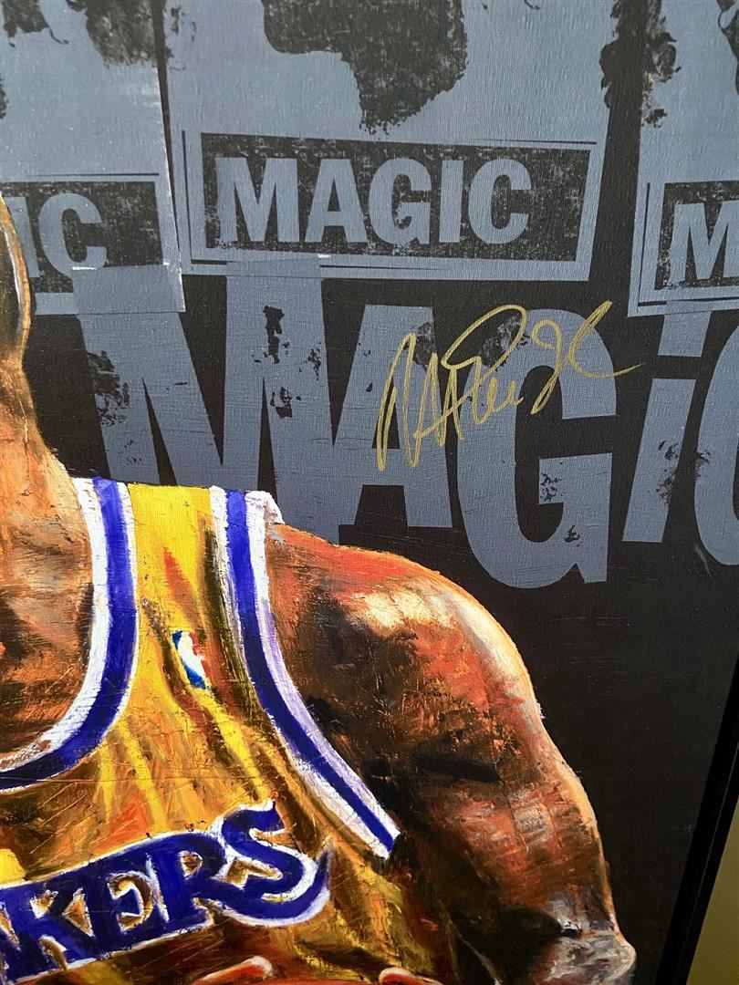 A stretched giclee on canvas, hand signed by the Magic Johnson & by artist Stephen Holland 29.5x42.5" w/ Certificate. Framed.
