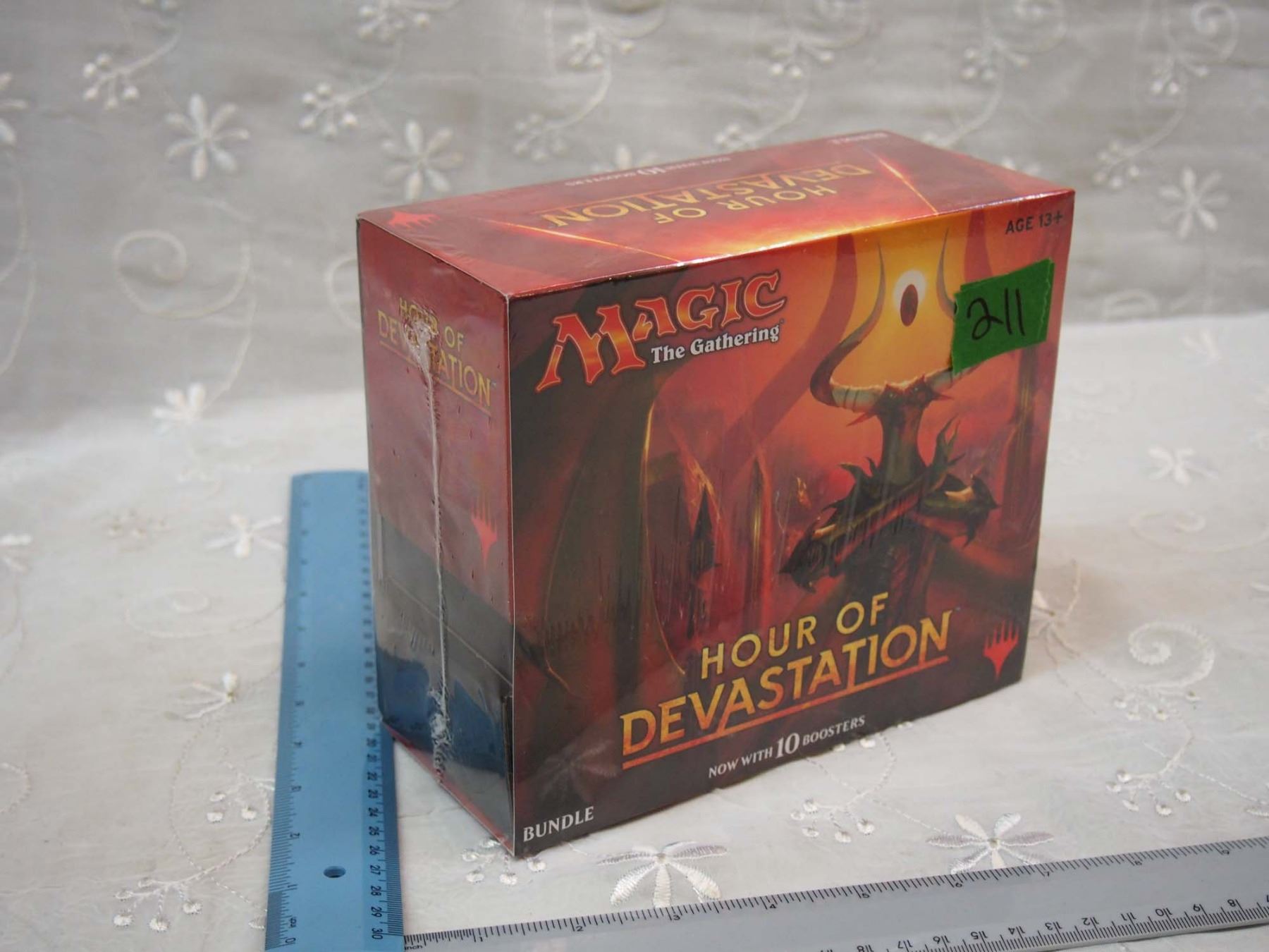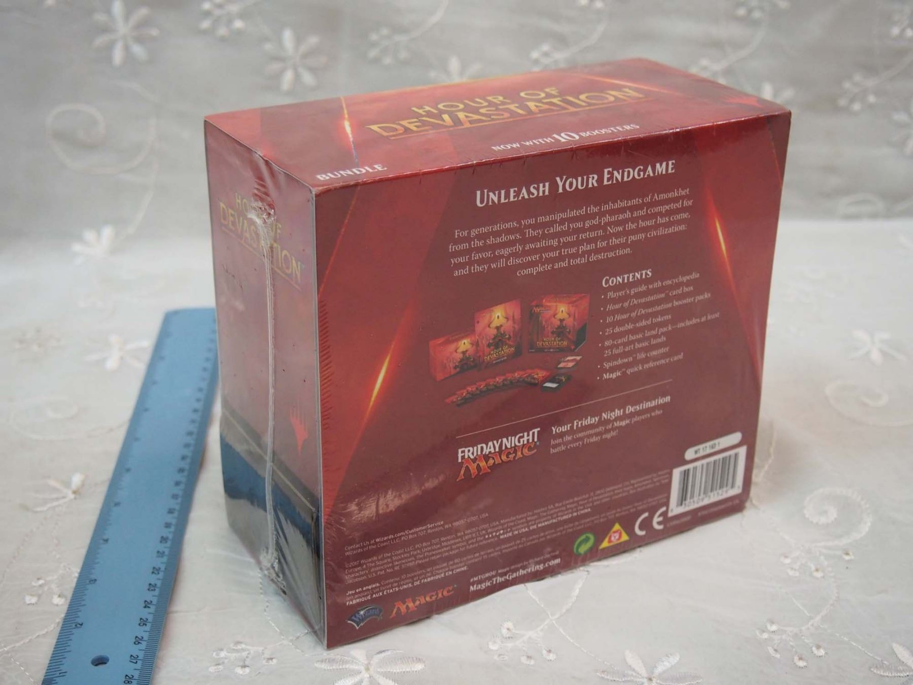 contains 10 Booster Packs! Contents of this unopened box: Player’s guide with encyclopedia, Hour of Devastation card box, 10 Hour of Devastation booster packs, 25 double-sided tokens, 80-card basic land pack, includes at least 25 full-art basic lands, spindown life counter & a Magic quick reference card!