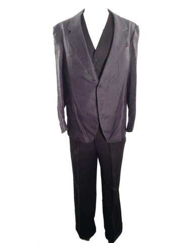 Howard Burkan (Simon McBurney) screen worn "Chris Kerr" dark blue suit jacket with light texture, black 5 button vest with a black silk back and a pair of dark blue/grey pants with orange and red pin stripes. Includes blue handkerchief with red, blue and yellow design.