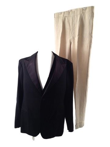 Magic in the Moonlight (2014) is a romantic comedy about an Englishman brought in to help unmask a possible swindle. Personal and professional complications ensue. Written and directed by Woody Allen. This is Howard Burkan's (Simon McBurney) screen worn "Chris Kerr" black tuxedo jacket, black vest with a 3 button front and silk back, pair of "Cosprop" cream pants with rough texture and two white half -vests.