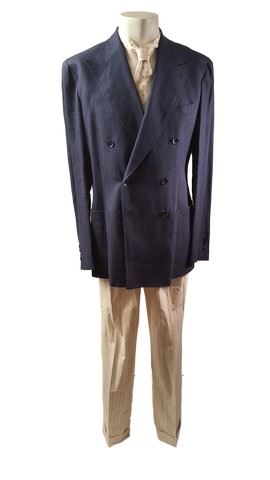 Screen worn dark blue "Polo by Ralph Lauren" suit jacket, a pair of white pants with dark blue pinstripes and a creamy white tie with light brown star and square symbols.