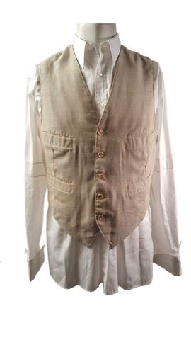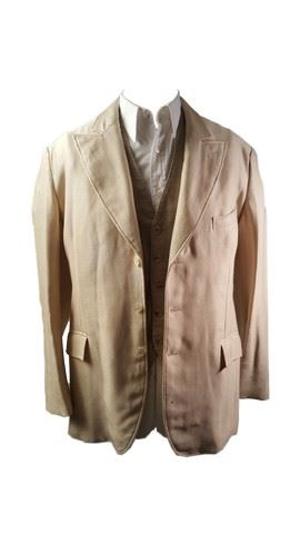 Screen worn cream colored "Cosprop" suit jacket and a light brown textured vest with two pockets on each side of the chest, and a white "Cosprop" front button shirt.