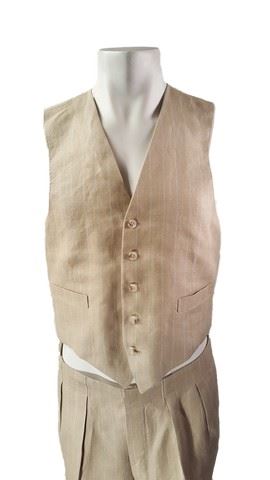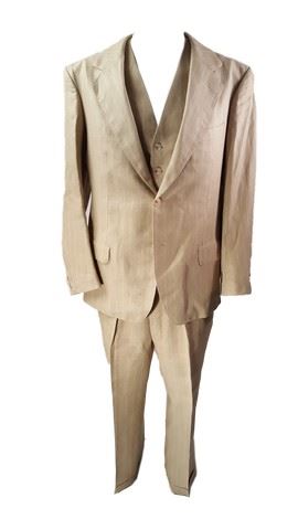 Magic in the Moonlight (2014) is a romantic comedy about an Englishman brought in to help unmask a possible swindle. Personal and professional complications ensue. Written and directed by Woody Allen. This is Stanley's (Colin Firth) screen worn, "Chris Kerr" beige suit jacket with white pinstripes. Includes matching vest and pants.