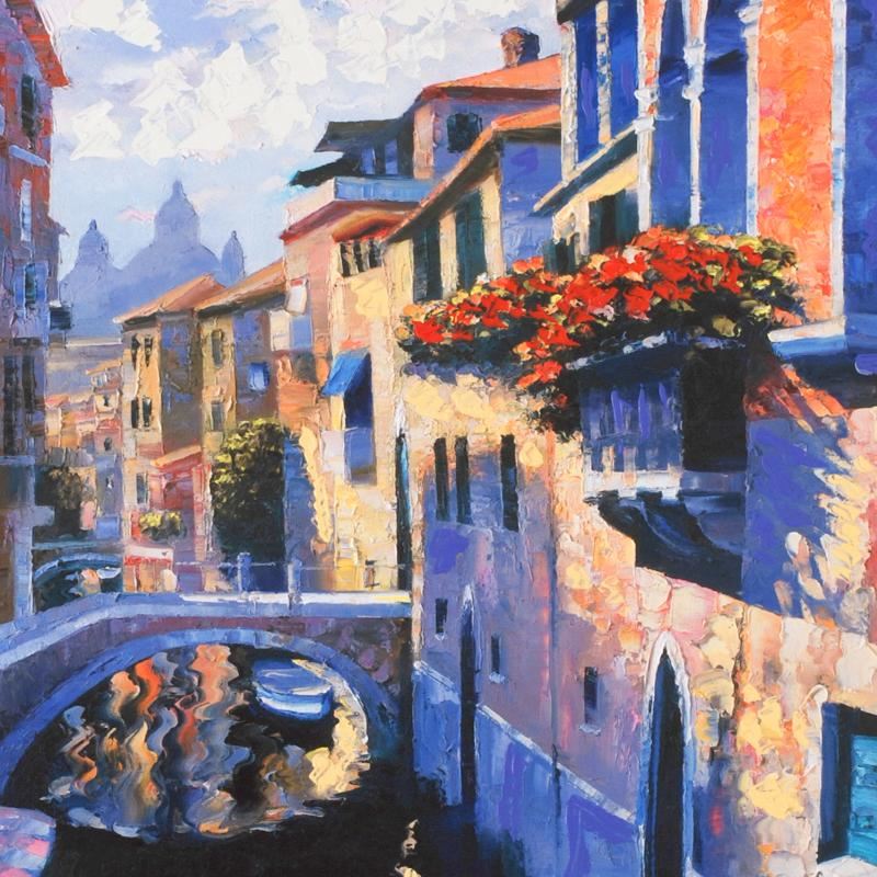 With bright colors and lush textures, Howard Behrens' artwork adds a tropical and exotic feel to any art collection. "Magic of Venice III" is a limited edition hand embellished giclee on canvas. Numbered and hand signed by the artist. Includes Certificate of Authenticity! Measures approx. 16" x 20"(image).