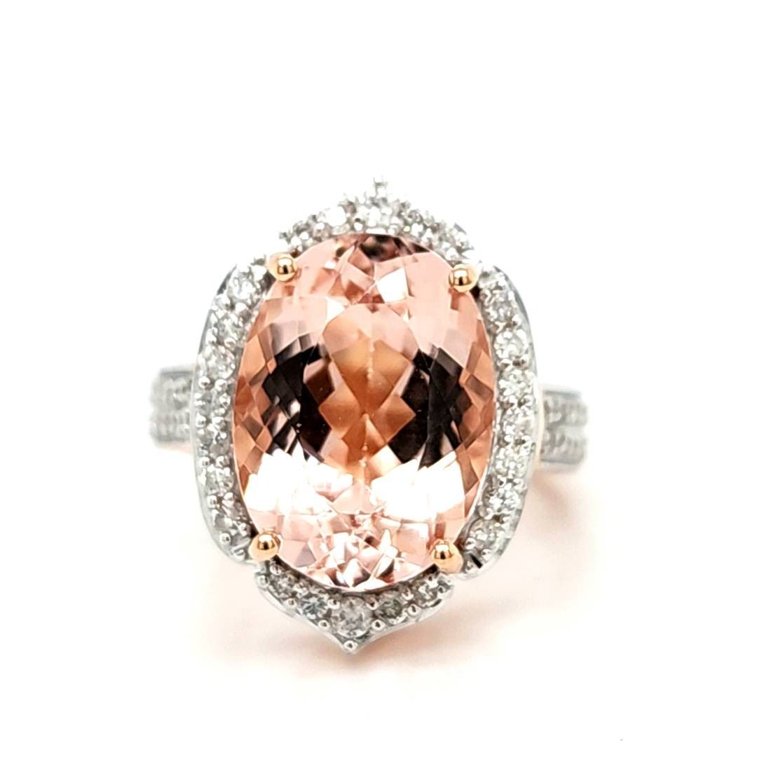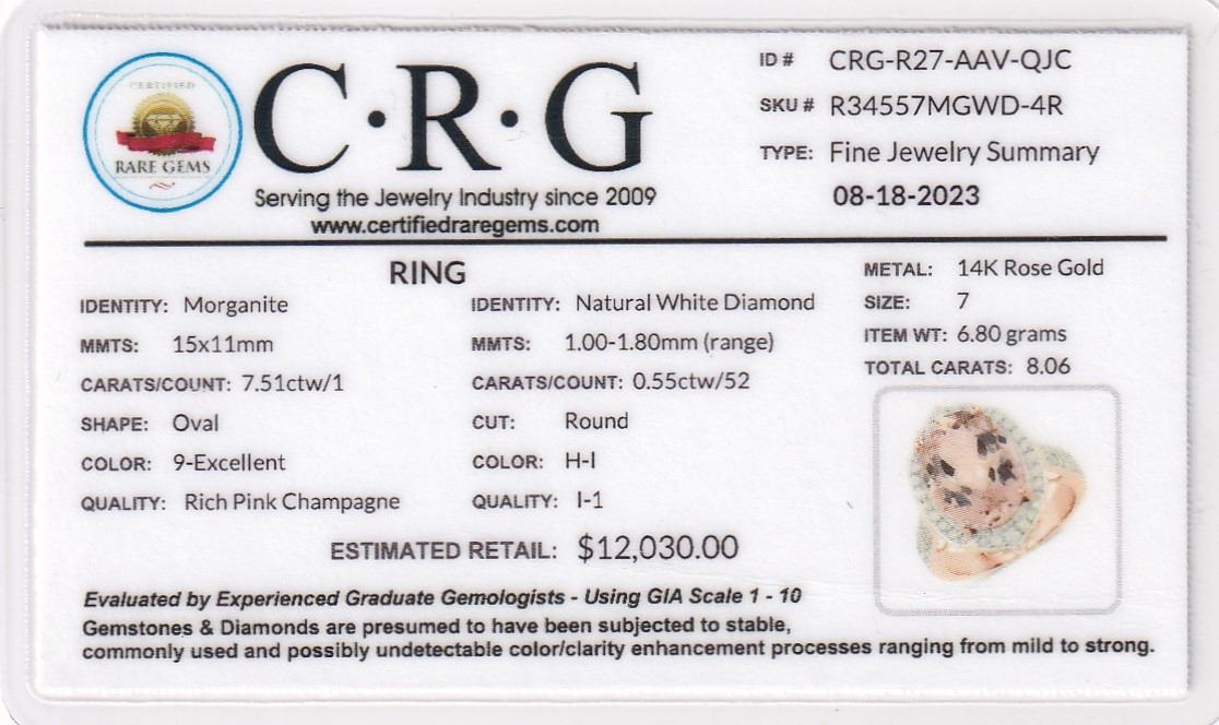 Genuine Morganite and Earth-Mined Diamond Ring.& nbsp; This is a 14 karat rose gold ring that features a 7.51 carat oval-cut Morganite that is prong-set with .55 carats of round, brilliant-cut, H-I color, I1 clarity diamonds in the fancy halo and wide shoulders.& nbsp; This ring is US size 7 and ha an approximate 3.2 mm shank and raised gallery.& nbsp; This ring can be resized for an additional $100, please allow an additional 10 days for shipping if we resize it.& nbsp; This ring is certified and appraised for $12,030.00 estimated retail replacement value.& nbsp;& nbsp;