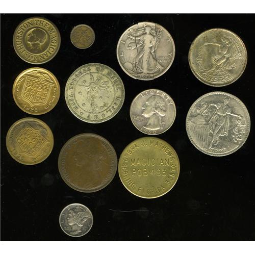 <B>Magician Token Group Lot.</B></I> Consists of 12 miscellaneous tokens and medals issued by some of the world's famous magicians, of the likes of Thurston and Adams. Current market value is approximately $75-$100.<BR><BR><b>Shipping:</b> Coin/Currency (<a target="_blank" href="http://www.heritageauctions.com/common/shipping.php">view shipping information</a>)