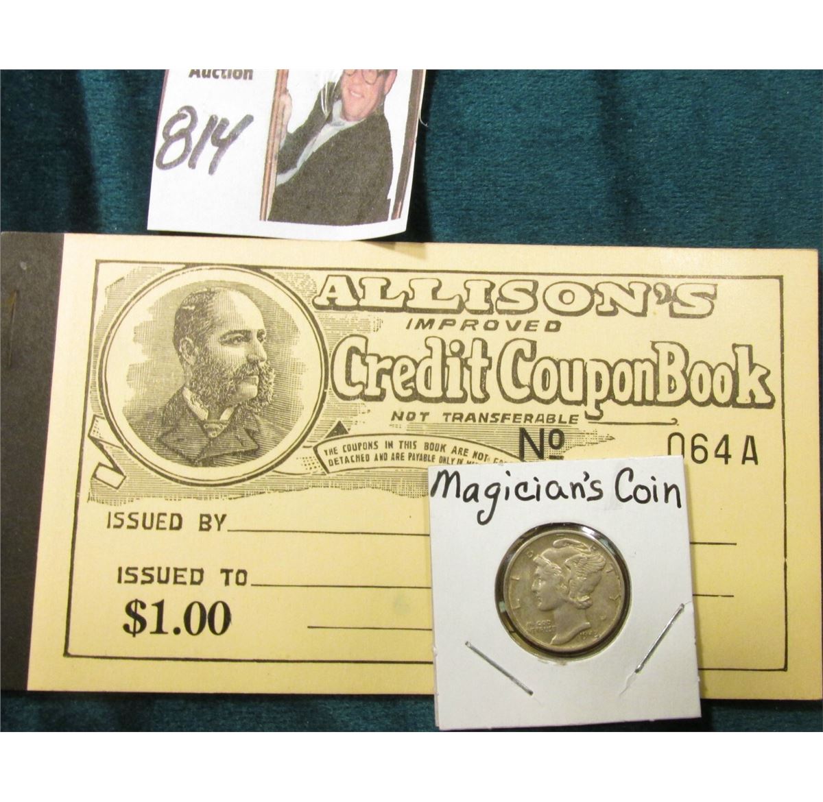 Magician's Coin, Mercury Dime on one side and reverse of a Wheat Cent on the other; & original Unused booklet 1930 era "Allison's Improved Credit Coupon Book" $1.00 Complete with coupons.