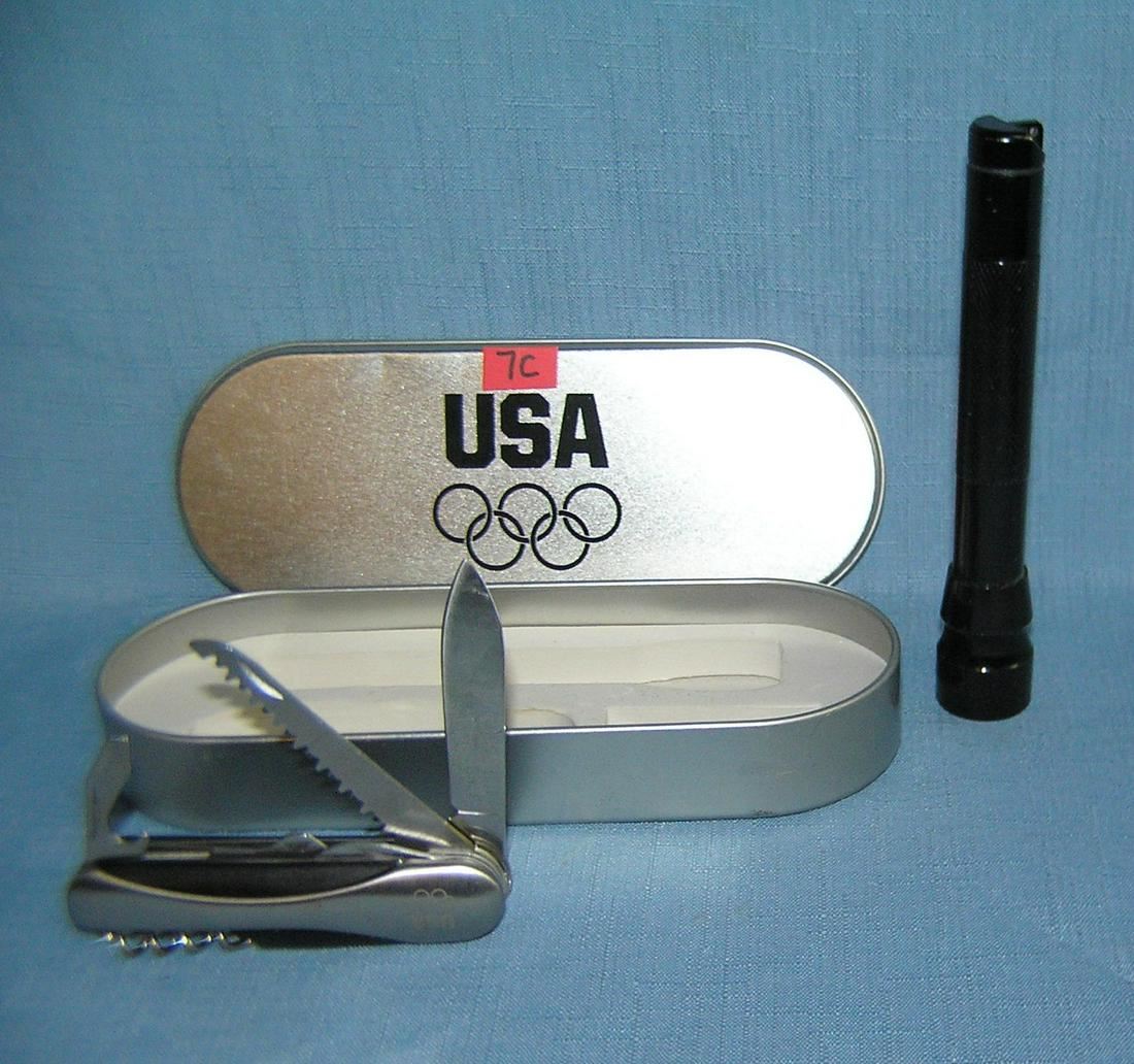 Maglite style flash light and US olympic multi blade survival pocket knife est. value $35.00-$40.00