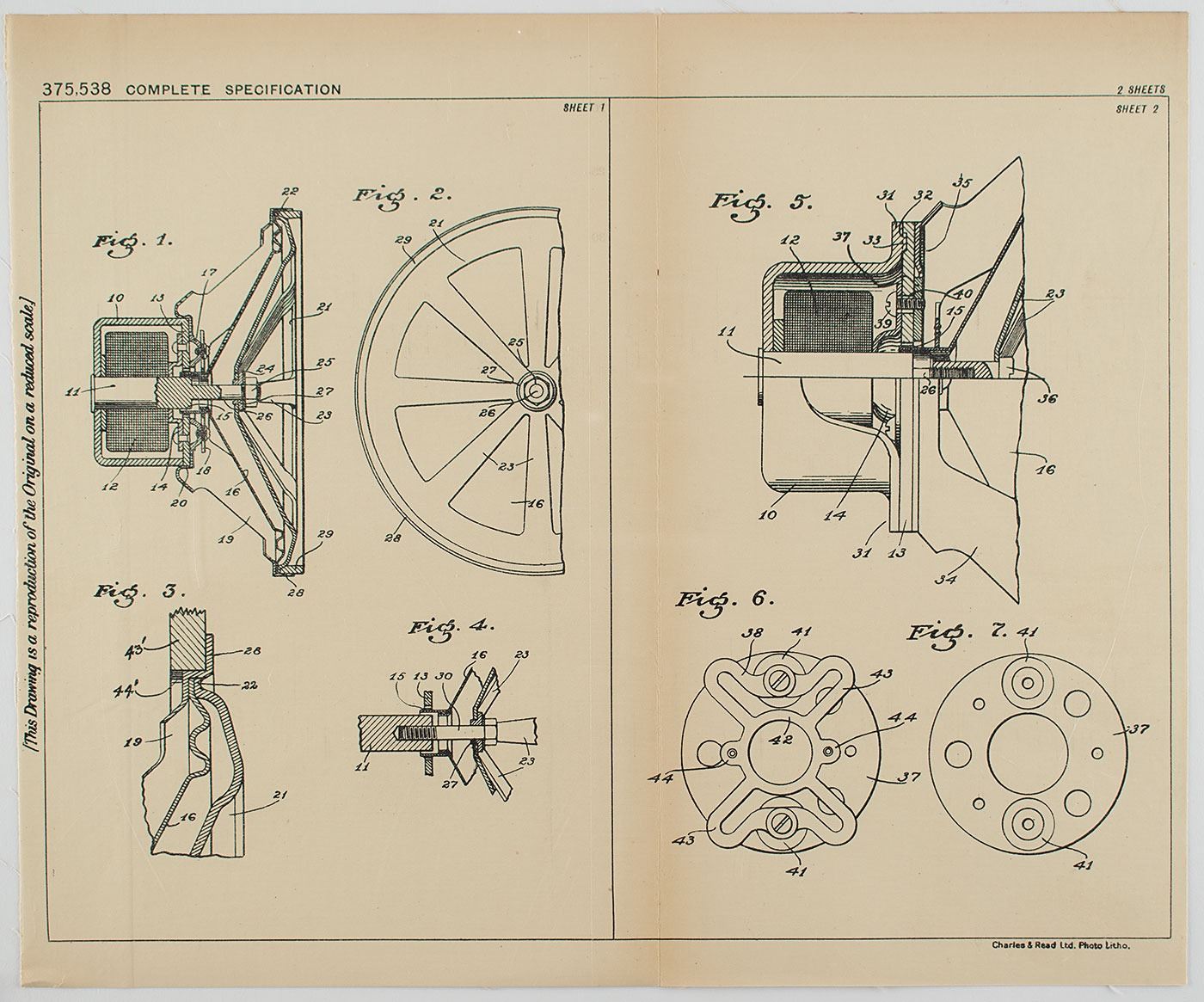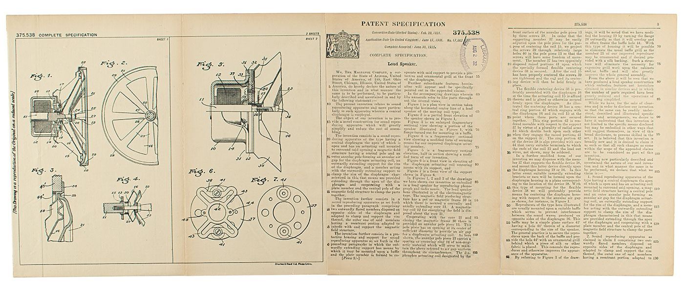Original linen-backed patent lithograph for the Magnavox Company's invention of a loud speaker, one page, 12.5 x 10.25, June 30, 1932. The diagram features multiple views of the speaker, which employs a conical diaphragm powered by an actuating coil. The top border reads: "375,538 Complete Specification." The lower border features the printed text: "Charles & Read Ltd. Photo-Litho." The left border reads: "This Drawing is a reproduction of the Original on a reduced scale." Includes the printed British "Patent Specification" document, four pages on two sheets, which describes the invention as "a novel construction for sound reproducing apparatus which will greatly simplify and reduce the cost of assembling." The specification sheet bears a "U.S. Patent Office Library" ink stamp on the first page. In fine condition.