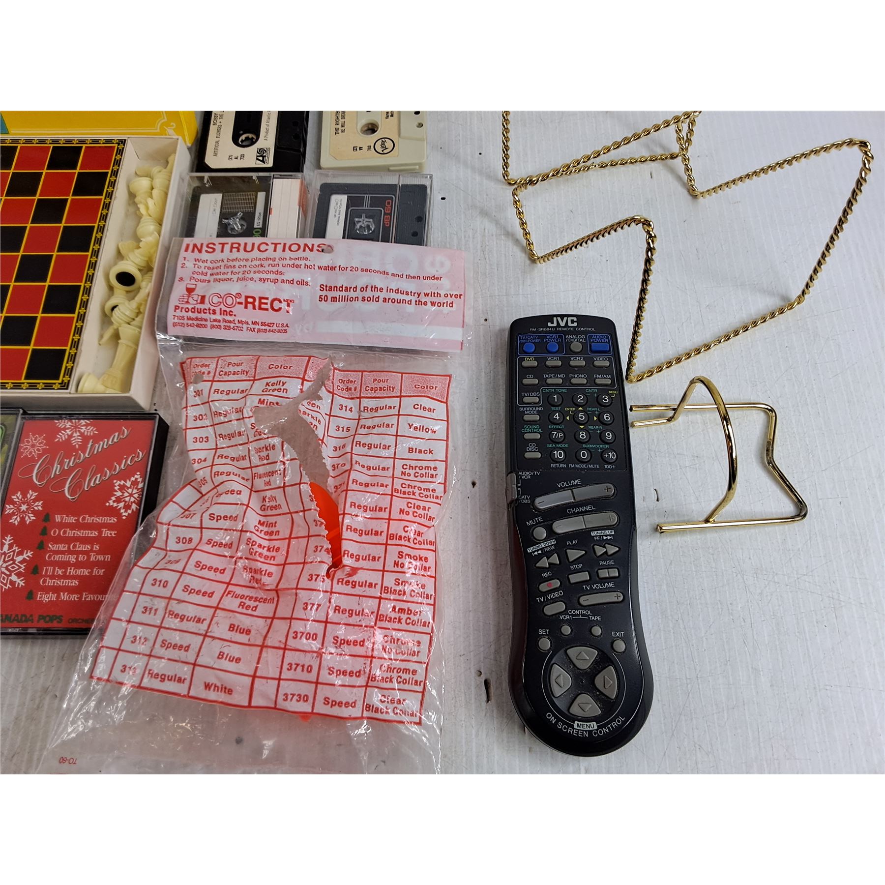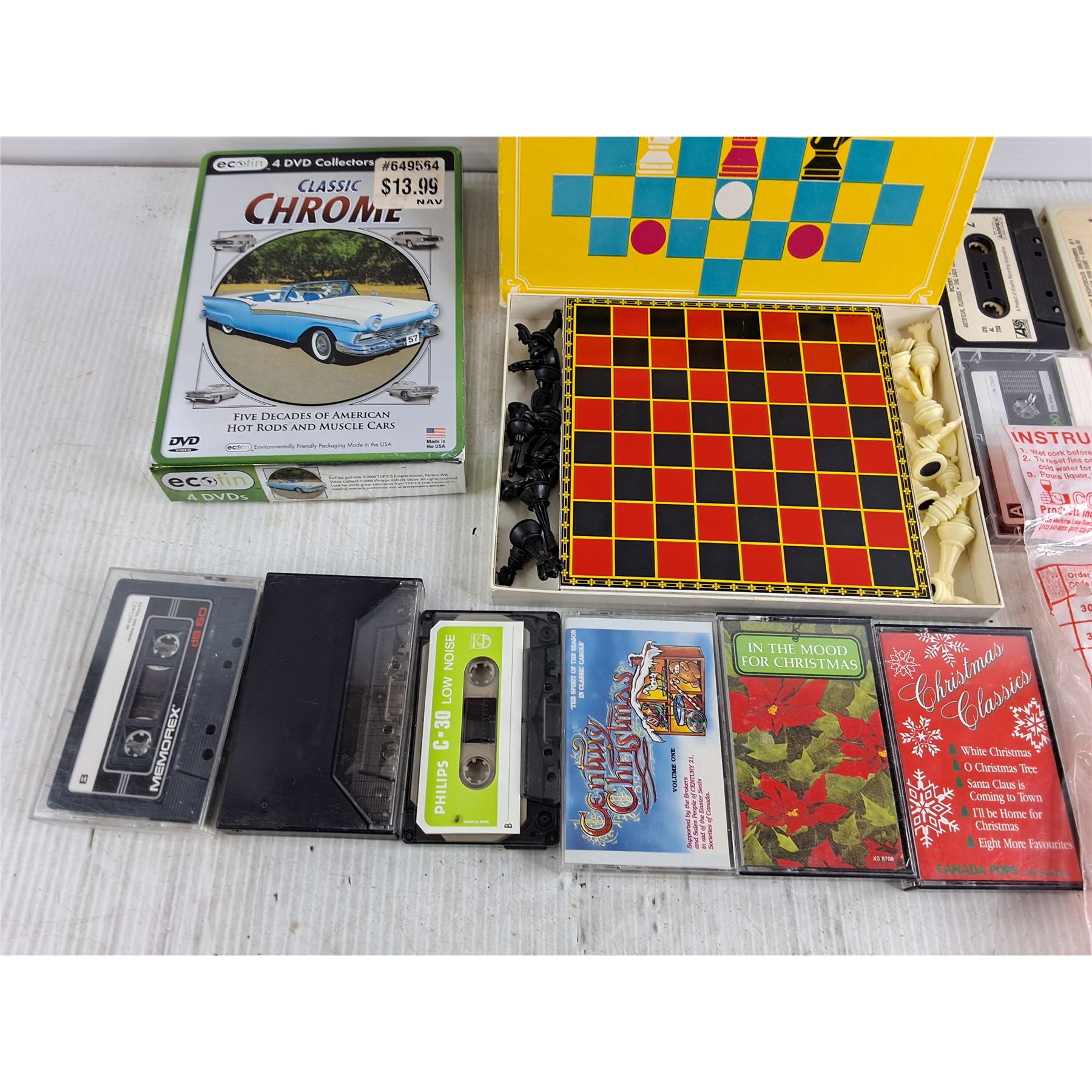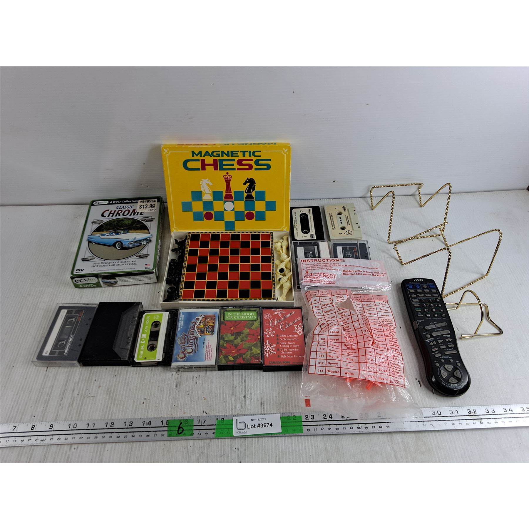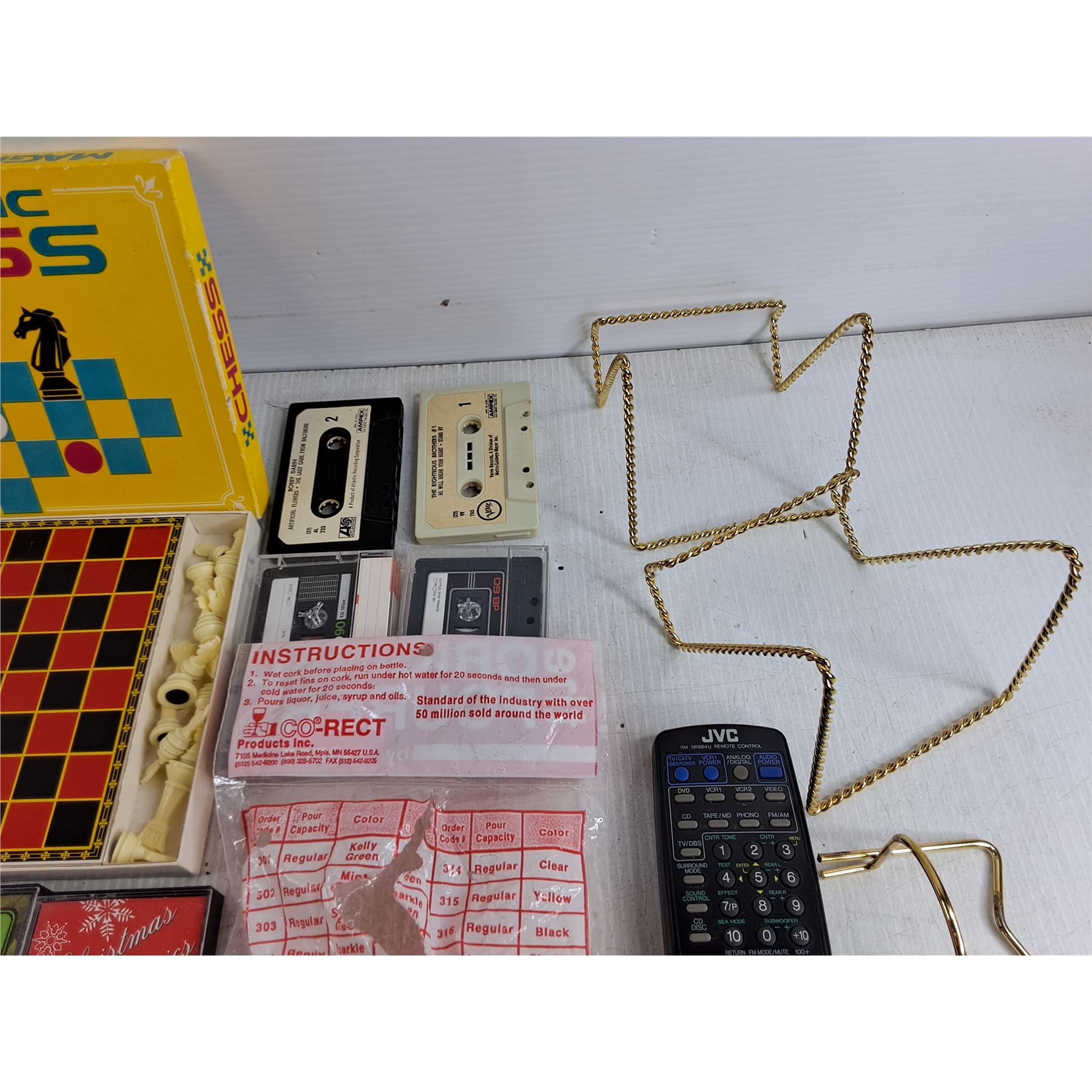 Magnetic Chess, Audio Cassettes, Pourers, JVC Remote, Classic Chrome DVD Collection, Misc