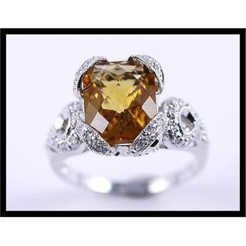 Magnificent ring with 1 honey/cognac citrine that weighs 3.77 carats and 20 diamonds that weigh 0.10 carat set in 14K white gold. The ring measures 13 millimeters (1/2 inches) long x 11 millimeters (7/16 inches) wide x 9 millimeters (5/16 inches) high and weighs 4.32 grams total weight.