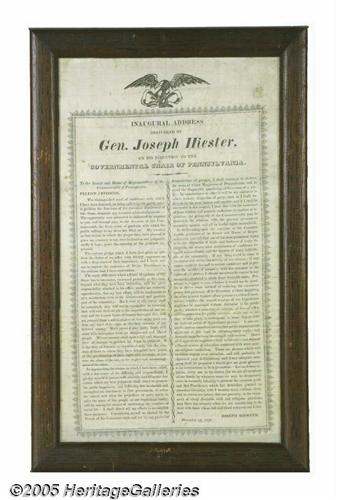 <B>Magnificent 1820 Inaugural Address by Pennsylvania Governor General Joseph Hiester on Silk</B></I> Dated 1820, silk printed broadside, "INAUGURAL ADDRESS DELIVERED BY GEN. JOSEPH HIESTER." Choice extremely fine. Large in size, measuring 16.75" x 9.5". This impressive address is printed on silvery-white silk, and framed to 19.5" x 12". Ornately designed in a large, two-column presentation by General Hiester, <I>"on his induction to the Governmental Chair of Pennsylvania."</B></I> Minor stains along left edge and top center do not detract from the overall beauty of this piece. This address is dated December 19, 1820 and signed in print at the conclusion by the general, <I>"JOSEPH HIESTER."</B></I> Nice printing of a Federal period heraldic eagle at top, its wings spread wide. An impressive display piece, well printed on silk and ready to hang. These silk political broadsides were widely produced during the 1820s-1840s, but this is one of the earliest we have seen. Silk is particularly vulnerable to deterioration, and one rarely sees an item of this type in such choice condition. Joseph Hiester (1752-1832), Governor of Pennsylvania (1820-1823). Wounded as a militia captain, he was held captive on a British prison ship during the American Revolution. He served five years in the state House of Representatives, four in the state Senate, and then fourteen years in Congress (1780-1805), and attended the State Constitutional Convention of 1789-1790. In 1807, he was commissioned as a major general in the Pennsylvania militia. After 1810, he became an "Old School" or "Independent" Jeffersonian Democrat. Defeated for governor in 1817, "the old general" was elected governor in 1820 at the age of 68. His administration was known for reducing expenditures and corruption, appointing men on their merits without regard for political or social affiliation, and aiding the expansion of public education. Known as "Old German Grey," he declined to run for a second term. Lot:255