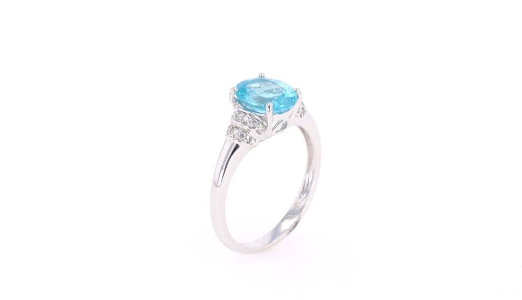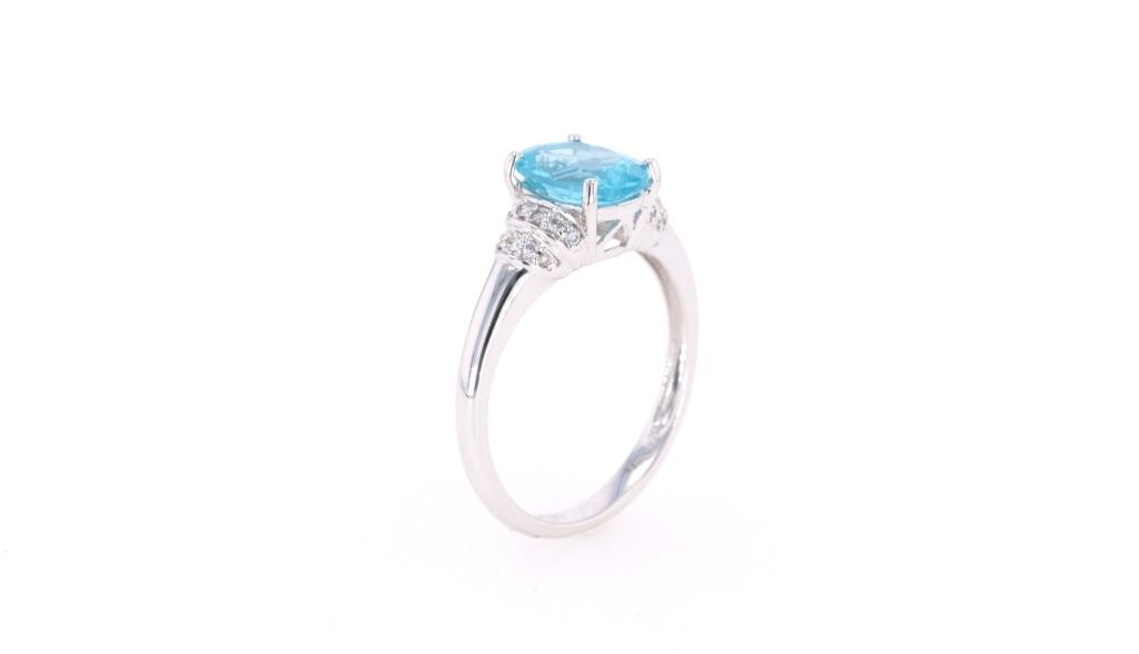 Featured in this lot is this magnificent apatite, diamond, and 18k white gold ring. The ring shows an 18k white gold cluster shoulder and four prong settings with a raised lattice under gallery and a gold weight of 2.62GM. The center stone is an oval cut apatite stone with a weight of 1.75 carats. The center stone is lavishly decorated by a cluster shoulder setting of 22 round brilliant cut diamonds with a weight of 0.10 carats. The ring shows the Color Jewels Inc. hallmark with an 18k gold stamp on the inside of the ring band. The ring size is US 7.