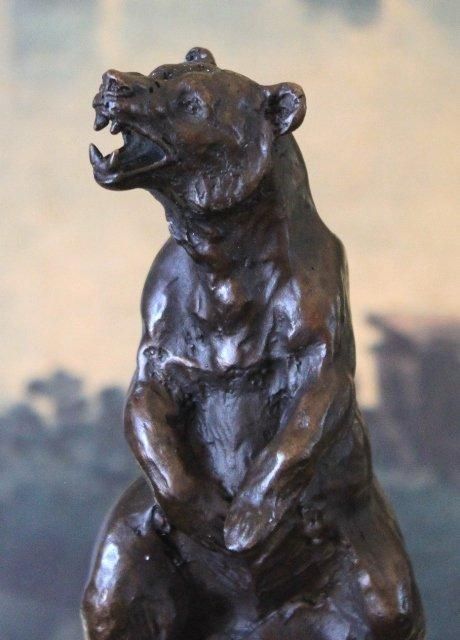 Magnificent Bear Bronze Sculpture After L Carvin 9 inH x 3 inW x 2 3/4in D 8lbs. TThis bronze sculpture was produced using the "Lost Wax" casting method. The "Lost Wax" Cast method is the most precise metal casting technique in existence, ensuring exquisite detail of the original host model which is usually sculpted in clay or wax. This "Lost Wax" casting method is an extremely labor intensive and expensive process, but the end results produce a Heirloom Quality Masterpiece!