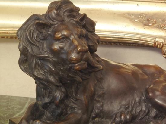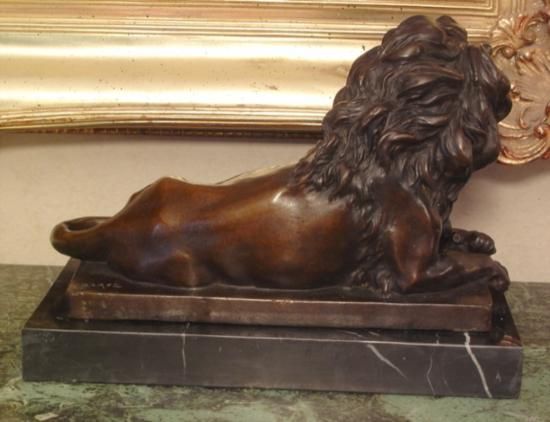 African Lion Bronze Sculpture, After Barye,  10"H x12"W x 7"D18 lbs  This bronze sculpture was produced using the "Lost Wax" casting method. The"Lost Wax" Cast method is the most precise metal casting technique in existence, ensuring exquisite detail of the original host model which is usually sculpted in clay or wax. This "Lost Wax" casting method is an extremely labor intensive and expensive process, but the end results produce a Heirloom Quality Masterpiece!Antoine-louis Barye (1796 - 1875) Originally trained as a goldsmith, Antoine-Louis Barye served in Napoleon's army before studying sculpture and painting. He entered the Ecole des Beaux-Arts in 1818 and adapted the romantic-style subject matter of violent and majestic animals. After his crocodile-like sculpture entitled Tiger Devouring a Gavail, won a medal at the Salon of 1831, Barye became a successful and independent sculptor and painter. His animal sculptures competed at the Salon alongside the more traditional and revered human figures. In 1845, Barye began a foundry that produced smaller and more affordable bronze statues. He was appointed the keeper of plaster casts at the Louvre and professor of zoological drawing at the Musee National d'Histoire Naturelle, both in Paris. Elected to the Academie in 1868, Barye inspired a later generation of animal sculptors who called themselves the animaliers.