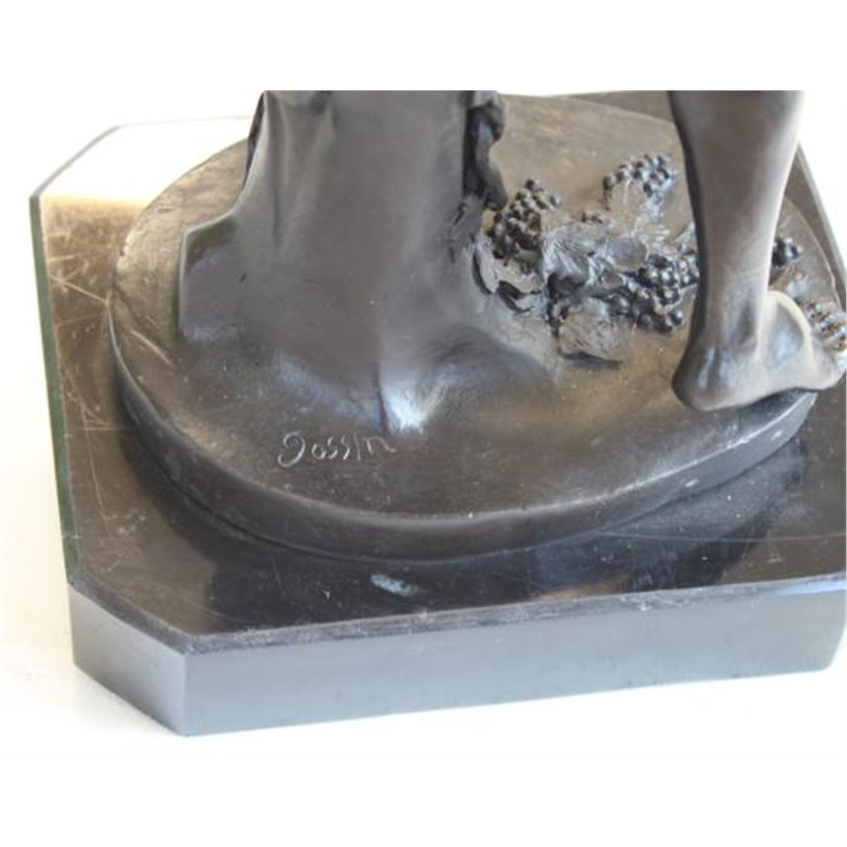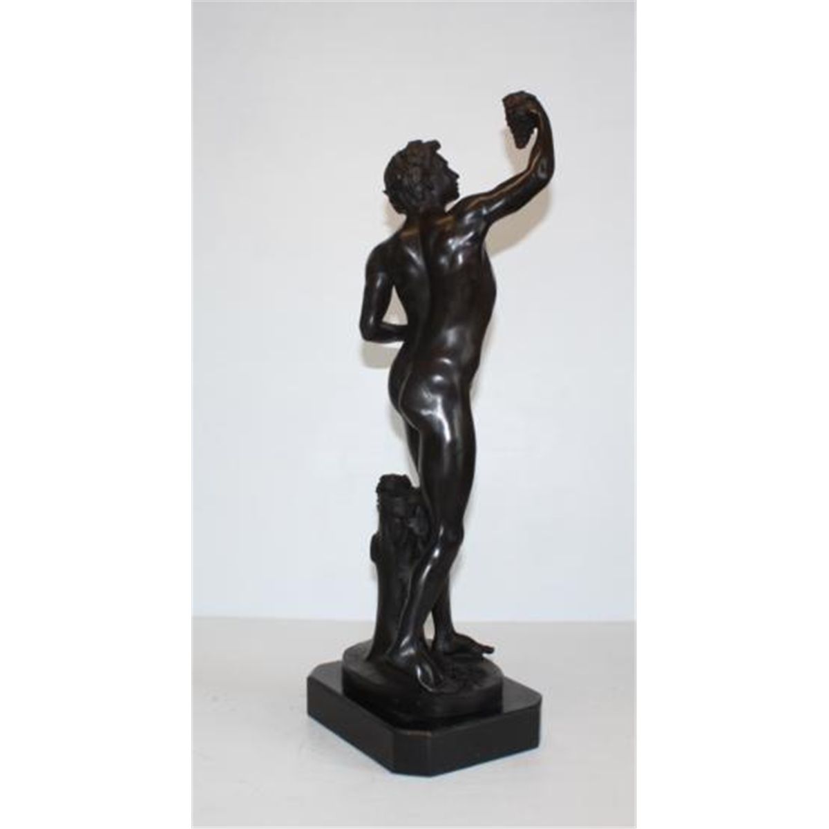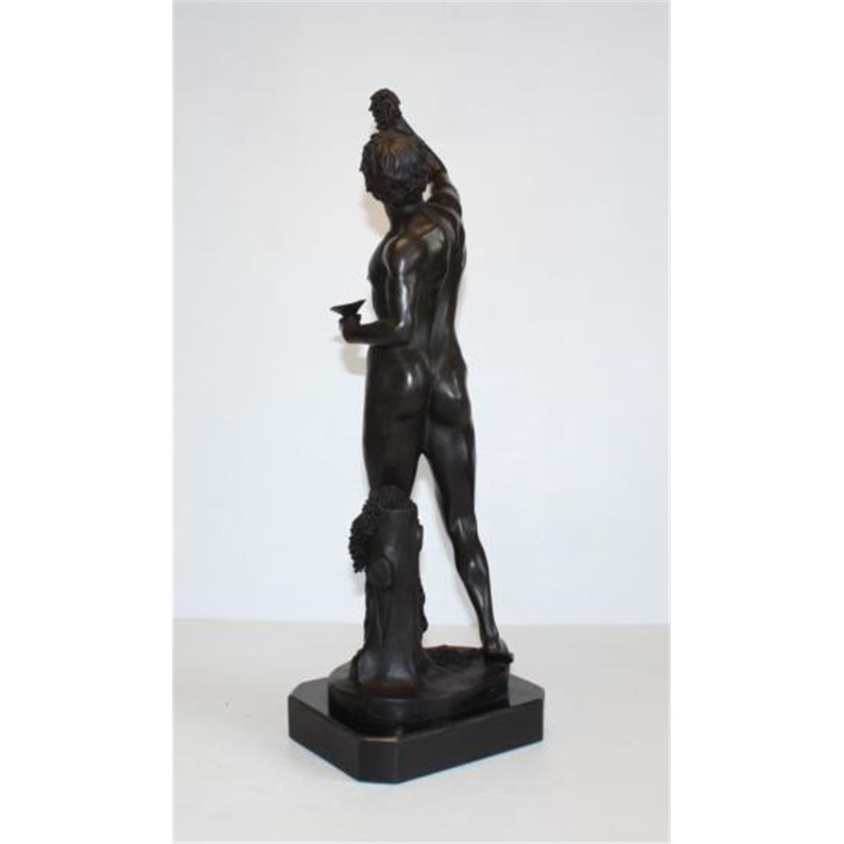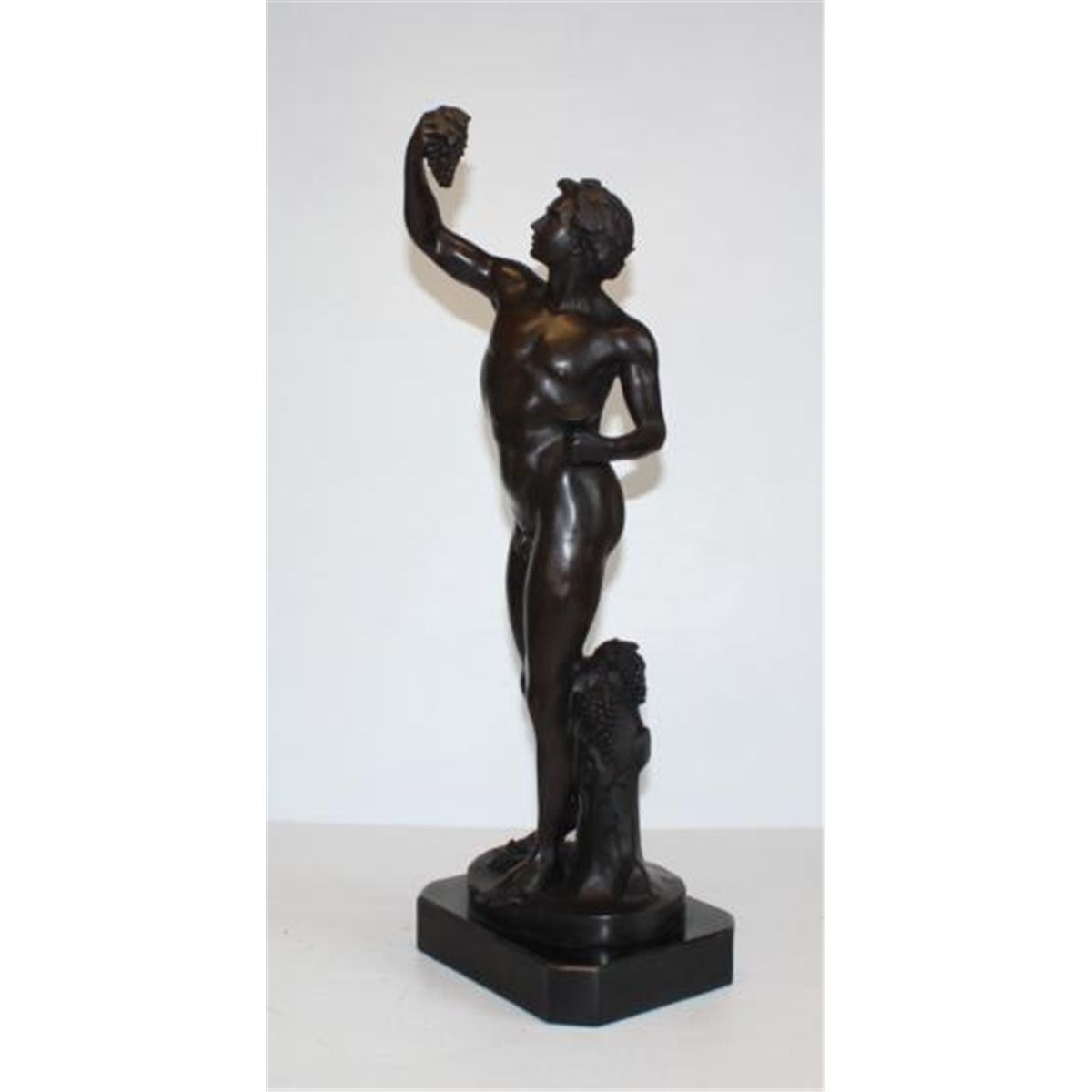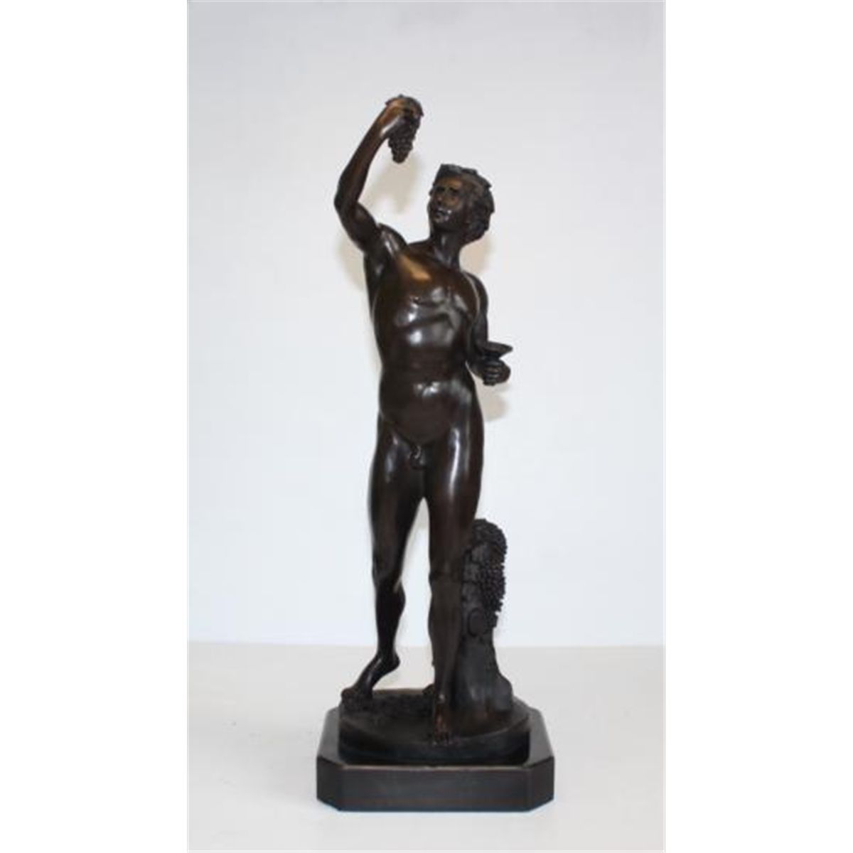 Bacchus Bronze Sculpture, After Tossin, 22"H x 7 1/2"W x 6 1/4"D 25 lbs. This bronze sculpture was produced using the "Lost Wax" casting method. The"Lost Wax" Cast method is the most precise metal casting technique in existence, ensuring exquisite detail of the original host model which is usually sculpted in clay or wax. This "Lost Wax" casting method is an extremely labor intensive and expensive process, but the end results produce a Heirloom Quality Masterpiece!