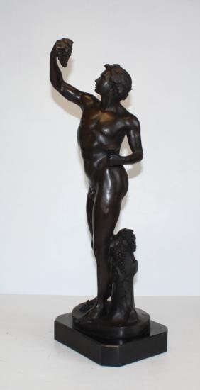 Bacchus Bronze Sculpture, After Tossin, 22"H x 7 1/2"W x 6 1/4"D 25 lbs. This bronze sculpture was produced using the "Lost Wax" casting method. The"Lost Wax" Cast method is the most precise metal casting technique in existence, ensuring exquisite detail of the original host model which is usually sculpted in clay or wax. This "Lost Wax" casting method is an extremely labor intensive and expensive process, but the end results produce a Heirloom Quality Masterpiece!