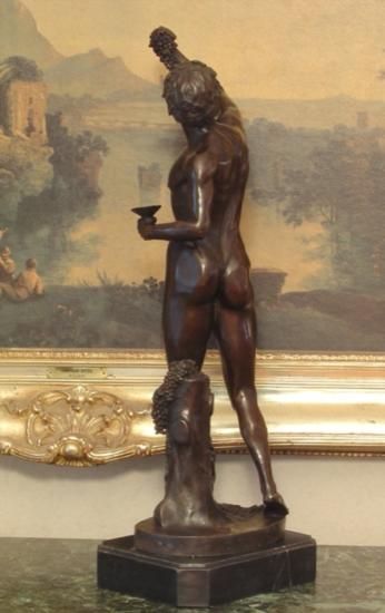 Bacchus Bronze Sculpture, After Tossin, 22"H x 7 1/2"W x 6 1/4"D 25 lbs. This bronze sculpture was produced using the "Lost Wax" casting method. The"Lost Wax" Cast method is the most precise metal casting technique in existence, ensuring exquisite detail of the original host model which is usually sculpted in clay or wax. This "Lost Wax" casting method is an extremely labor intensive and expensive process, but the end results produce a Heirloom Quality Masterpiece!