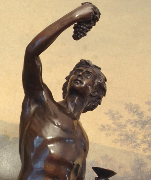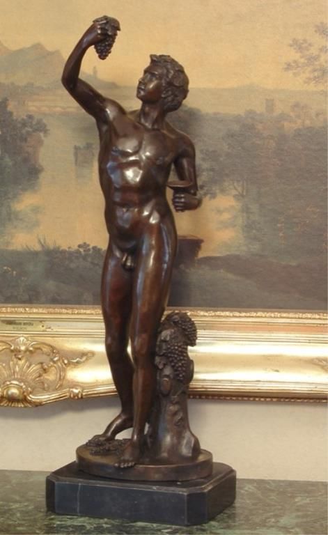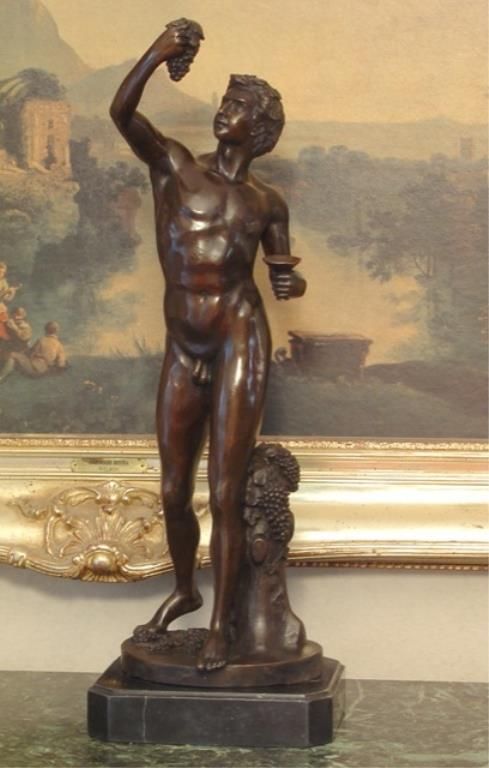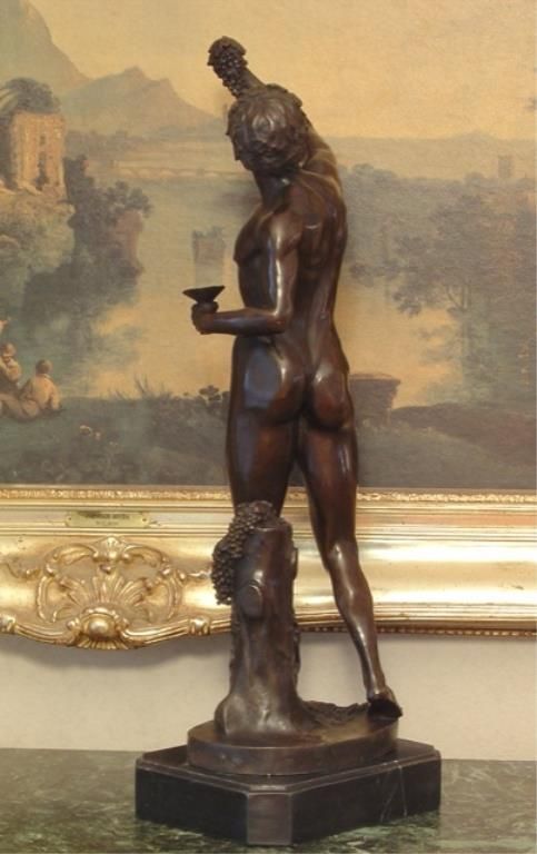 Bacchus Bronze Sculpture After Tossin 22H x 7 1/2W x 6 1/4D 25 lbs. This bronze sculpture was produced using the "Lost Wax" casting method. The "Lost Wax" Cast method is the most precise metal casting technique in existence, ensuring exquisite detail of the original host model which is usually sculpted in clay or wax. This "Lost Wax" casting method is an extremely labor intensive and expensive process, but the end results produce a Heirloom Quality Masterpiece!