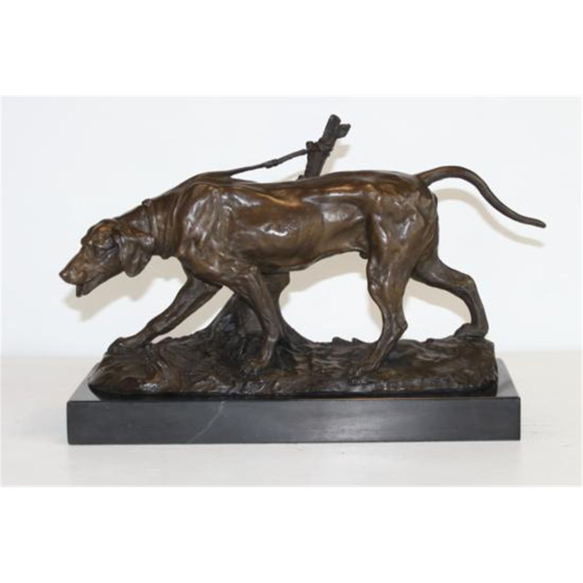 Coon Hound Bronze Sculpture, After Barye, 9"H x 14"W x 6"D20 lbs. This bronze sculpture was produced using the "Lost Wax" casting method. The"Lost Wax" Cast method is the most precise metal casting technique in existence, ensuring exquisite detail of the original host model which is usually sculpted in clay or wax. This "Lost Wax" casting method is an extremely labor intensive and expensive process, but the end results produce a Heirloom Quality Masterpiece! Antoine-louis Barye (1796 - 1875) Originally trained as a goldsmith, Antoine-Louis Barye served in Napoleon's army before studying sculpture and painting. He entered the Ecole des Beaux-Arts in 1818 and adapted the romantic-style subject matter of violent and majestic animals. After his crocodile-like sculpture entitled Tiger Devouring a Gavail, won a medal at the Salon of 1831, Barye became a successful and independent sculptor and painter. His animal sculptures competed at the Salon alongside the more traditional and revered human figures. In 1845, Barye began a foundry that produced smaller and more affordable bronze statues. He was appointed the keeper of plaster casts at the Louvre and professor of zoological drawing at the Musee National d'Histoire Naturelle, both in Paris. Elected to the Academie in 1868, Barye inspired a later generation of animal sculptors who called themselves the animaliers.
