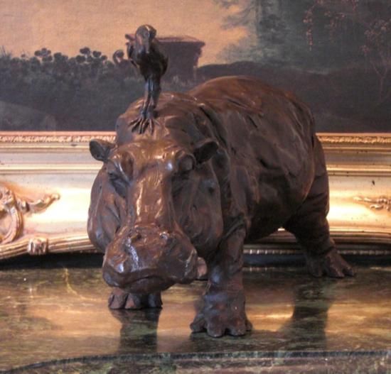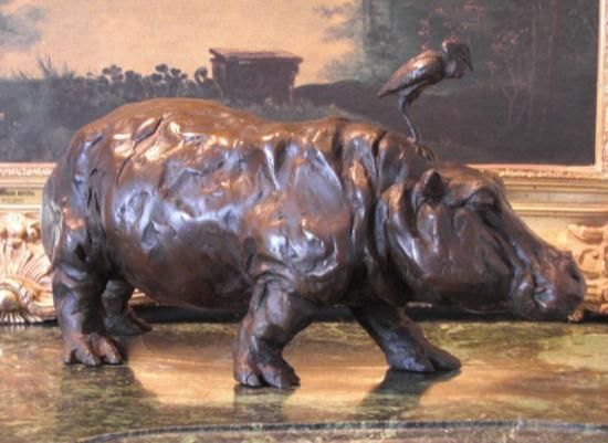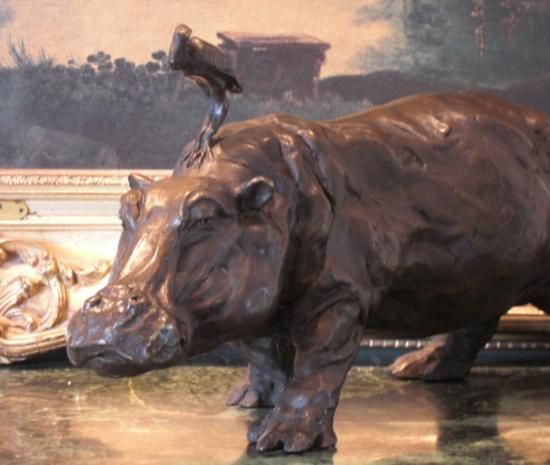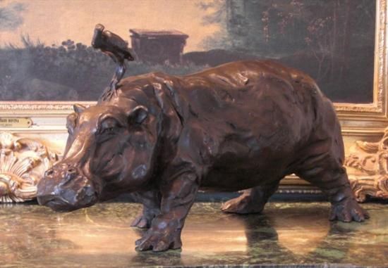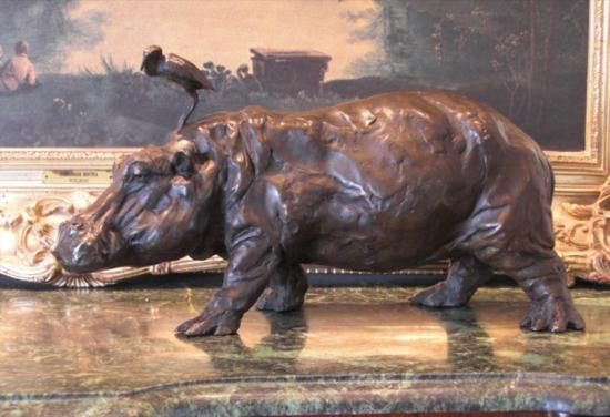 Hippopotamus Hippo Bronze Sculpture, After Barye, 9"H x 16"W x 7"D 16 lbs. This bronze sculpture was produced using the "Lost Wax" casting method. The"Lost Wax" Cast method is the most precise metal casting technique in existence, ensuring exquisite detail of the original host model which is usually sculpted in clay or wax. This "Lost Wax" casting method is an extremely labor intensive and expensive process, but the end results produce a Heirloom Quality Masterpiece!Antoine-louis Barye (1796 - 1875) Originally trained as a goldsmith, Antoine-Louis Barye served in Napoleon's army before studying sculpture and painting. He entered the Ecole des Beaux-Arts in 1818 and adapted the romantic-style subject matter of violent and majestic animals. After his crocodile-like sculpture entitled Tiger Devouring a Gavail, won a medal at the Salon of 1831, Barye became a successful and independent sculptor and painter. His animal sculptures competed at the Salon alongside the more traditional and revered human figures. In 1845, Barye began a foundry that produced smaller and more affordable bronze statues. He was appointed the keeper of plaster casts at the Louvre and professor of zoological drawing at the Musee National d'Histoire Naturelle, both in Paris. Elected to the Academie in 1868, Barye inspired a later generation of animal sculptors who called themselves the animaliers.The hippopotamus (Hippopotamus amphibius) or hippo, hippos, riverhorse, is a large, mostly plant-eating mammal in sub-Saharan Africa, and one of only two extant species in the family Hippopotamidae (the other is thePygmy Hippopotamus). The hippopotamus is the heaviest extant artiodactyl, despite being considerably shorter than the giraffe.This compound word is the wrong way round for Greek and correctly would mean "horse-river". The more common Ancient Greek term was ?pp?? p?taµ?? "horse of river",The hippopotamus is semi-aquatic, inhabiting rivers and lakes where territorial bulls preside over a stretch of river and groups of 5 to 30 females and young. During the day they remain cool by staying in the water or mud; reproduction and childbirth both occur in water. They emerge at dusk to graze on grass. While hippopotamuses rest near each other in the water, grazing is a solitary activity and hippos are not territorial on land.Despite their physical resemblance to pigs and other terrestrial even-toed ungulates, their closest living relatives are cetaceans (whales, porpoises, etc.) from which they diverged about million years ago.The common ancestor of whales and hippos split from other even-toed ungulates around million years ago. The earliest known hippopotamus fossils, belonging to the genus Kenyapotamusin Africa, date to around million years ago.The hippopotamus is recognizable by its barrel-shaped torso, enormous mouth and teeth, nearly-hairless body, stubby legs and tremendous size. It is the third-largest land mammal by weight (between 1½ and 3½ tons), behind the white rhinoceros (1½ to 4 tons) and elephants (3 to 7 tons). Despite its stocky shape and short legs, it can easily outrun a human. Hippos have been clocked at 18 mph (29 km/h) over short distances. The hippopotamus is one of the most aggressive creatures in the world and is often regarded as the most ferocious animal in Africa. There are an estimated 125,000 to 150,000 hippos throughout Sub-Saharan Africa; Zambia (40,000) and Tanzania (20,000-30,000) possess the largest populations. They are still threatened by habitat loss and poaching for their meat and ivory canine teeth.
