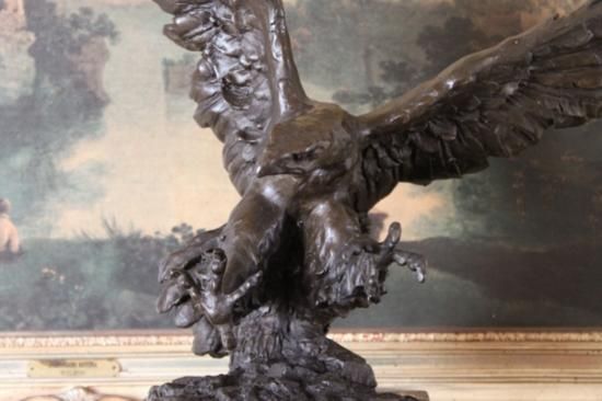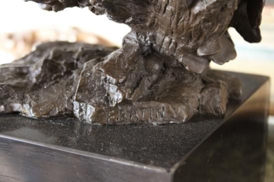 Landing Eagle Bronze Sculpture, After F. Ratin - 20"H x 15"W x 8.5"D 32 lbs. This bronze sculpture was produced using the "Lost Wax" casting method. The"Lost Wax" Cast method is the most precise metal casting technique in existence, ensuring exquisite detail of the original host model which is usually sculpted in clay or wax. This "Lost Wax" casting method is an extremely labor intensive and expensive process, but the end results produce a Heirloom Quality Masterpiece!