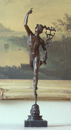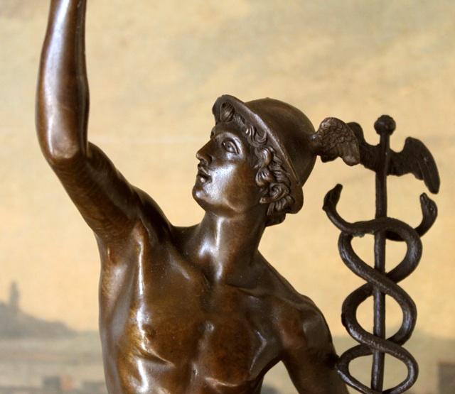Mercury & Caduceus, Bronze Sculpture, 22"H x11"D x 11"W 14 lbs This bronze sculpture was produced using the "Lost Wax" casting method. The"Lost Wax" Cast method is the most precise metal casting technique in existence, ensuring exquisite detail of the original host model which is usually sculpted in clay or wax. This "Lost Wax" casting method is an extremely labor intensive and expensive process, but the end results produce a Heirloom Quality Masterpiece!