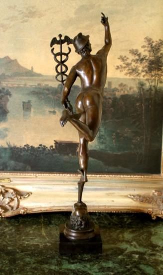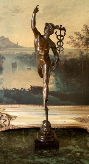 Mercury & Caduceus, Bronze Sculpture, 22"H x11"D x 11"W 14 lbs This bronze sculpture was produced using the "Lost Wax" casting method. The"Lost Wax" Cast method is the most precise metal casting technique in existence, ensuring exquisite detail of the original host model which is usually sculpted in clay or wax. This "Lost Wax" casting method is an extremely labor intensive and expensive process, but the end results produce a Heirloom Quality Masterpiece!