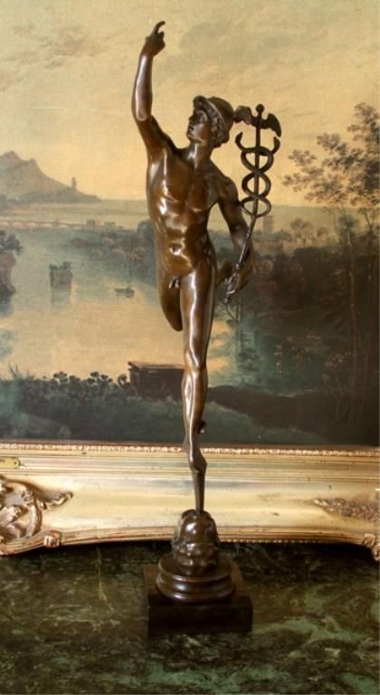 Mercury & Caduceus Bronze Sculpture 22H x11D x 11W 14 lbs This bronze sculpture was produced using the "Lost Wax" casting method. The "Lost Wax" Cast method is the most precise metal casting technique in existence, ensuring exquisite detail of the original host model which is usually sculpted in clay or wax. This "Lost Wax" casting method is an extremely labor intensive and expensive process, but the end results produce a Heirloom Quality Masterpiece!