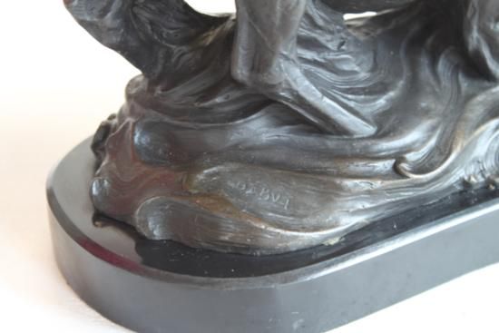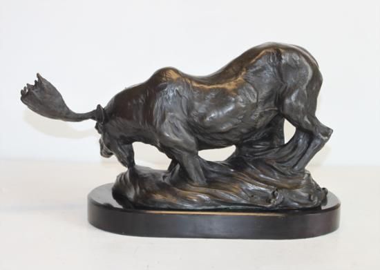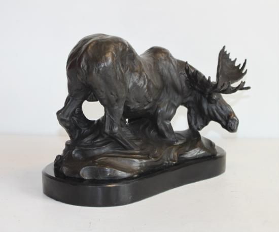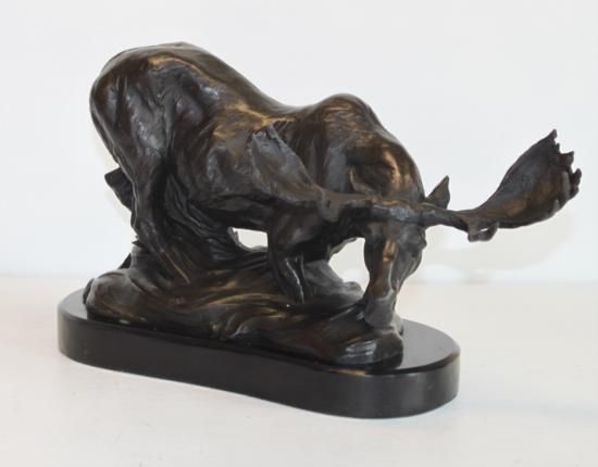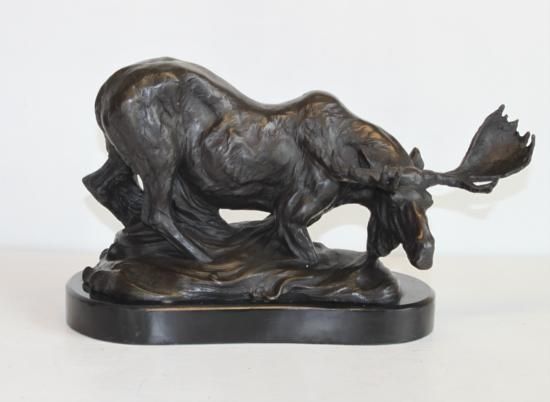 Moose in the Marsh, After Debvt, Bronze Sculpture 8"H x 14"L 8"W 20 lbs. This bronze sculpture was produced using the "Lost Wax" casting method. The"Lost Wax" Cast method is the most precise metal casting technique in existence, ensuring exquisite detail of the original host model which is usually sculpted in clay or wax. This "Lost Wax" casting method is an extremely labor intensive and expensive process, but the end results produce a Heirloom Quality Masterpiece!
