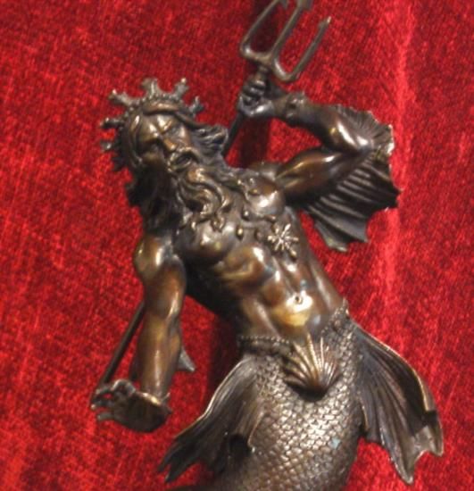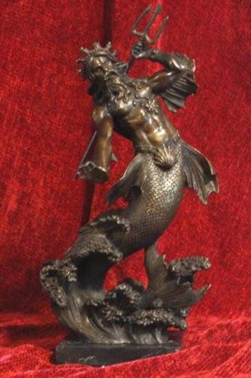 Poseidon God of the Sea Bronze Sculpture, After Barye, 13"H x 7"W x 6"D 11 lbs. This bronze sculpture was produced using the "Lost Wax" casting method. The"Lost Wax" Cast method is the most precise metal casting technique in existence, ensuring exquisite detail of the original host model which is usually sculpted in clay or wax. This "Lost Wax" casting method is an extremely labor intensive and expensive process, but the end results produce a Heirloom Quality Masterpiece!Poseidon (Greek: ??se?d??; Latin: Neptunus) was the god of the sea, storms, and, as "Earth-Shaker," ofearthquakes in Greek mythology. The name of the sea-god Nethuns in Etruscan was adopted in Latin for Neptune inRoman mythology: both were sea gods analogous to Poseidon. Linear B tablets show that Poseidon was venerated atPylos and Thebes in pre-Olympian Bronze Age Greece, but he was integrated into the Olympian gods as the brother of Zeus and Hades. Poseidon has many children. There is a Homeric hymn to Poseidon, who was the protector of many Hellenic cities, although he lost the contest for Athens to Athena.