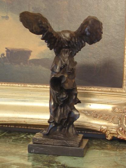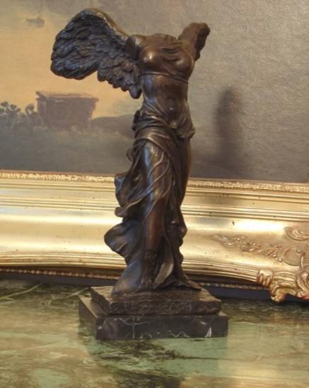 Winged Victory of Samothrace Bronze Sculpture, 11" H x 7"W x 7"D 11 lbs. This bronze sculpture was produced using the "Lost Wax" casting method. The"Lost Wax" Cast method is the most precise metal casting technique in existence, ensuring exquisite detail of the original host model which is usually sculpted in clay or wax. This "Lost Wax" casting method is an extremely labor intensive and expensive process, but the end results produce a Heirloom Quality Masterpiece!