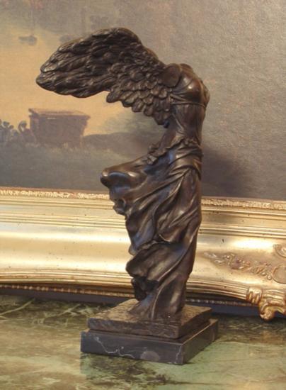 Winged Victory of Samothrace Bronze Sculpture, After Noee, 11" H x 7"W x 7"D 11 lbs. This bronze sculpture was produced using the "Lost Wax" casting method. The"Lost Wax" Cast method is the most precise metal casting technique in existence, ensuring exquisite detail of the original host model which is usually sculpted in clay or wax. This "Lost Wax" casting method is an extremely labor intensive and expensive process, but the end results produce a Heirloom Quality Masterpiece!The Winged Victory of Samothrace, also called the Nike of Samothrace, is a third century B.C. marble sculpture of theGreek goddess Nike (Victory). Since 1884, it has been prominently displayed at the Louvre and is one of the most celebrated sculptures in the world.The Nike of Samothrace was discovered in 1863, but was estimated to have been created around 203 B.C It was created to not only honor the goddess, Nike, but to honor a sea battle. It conveys a sense of action and triumph as well as portraying artful flowing drapery through its features which the Greeks considered ideal beauty. The beautiful statue is currently displayed in the Louvre Museum in Paris.Modern excavations suggest that the Victory occupied a niche in an open-air theater and also suggest it accompanied an altar that was within view of the ship monument of Demetrius I Poliorcetes (337-283 BC). Rendered in white Parian marble, the figure originally formed part of theSamothrace temple complex dedicated to the Great Gods, Megalon Theon. It stood on a rostral pedestal of gray marble from Lartos representing the prow of a ship (most likely a trihemiolia), and represents the goddess as she descends from the skies to the triumphant fleet. Before she lost her arms, which have never been recovered, Nike's right arm was raised, cupped round her mouth to deliver the shout of Victory. The work is notable for its naturalistic pose and for the rendering of the figure's draped garments, depicted as if rippling in a strong sea breeze, which is considered especially compelling.The statue's outstretched right wing is a symmetric plaster version of the original left one. As with the arms, the figure's head has never been found, but various other fragments have since been found: in 1950, a team led by Karl Lehmann unearthed the missing right hand of the Louvre's Winged Victory. The fingerless hand had slid out of sight under a large rock, near where the statue had originally stood; on the return trip home, Dr Phyllis Williams Lehmann identified the tip of the Goddess's ring finger and her thumb in a storage drawer at the Kunsthistorisches Museum, Vienna, where the second Winged Victory is displayed; the fragments have been reunited with the hand, which is now in a glass case in the Louvre next to the podium on which the statue stands.The statue now stands over a supplementary platform over the prow that allows a better contemplation but was not present in the original. The different degree of finishing of the sides has led scholars to think that it was intended to be seen from three-quarters on the left.A partial inscription on the base of the statue includes the word "Rhodhios" (Rhodes), indicating that the statue was commissioned to celebrate a naval victory by Rhodes, at that time the most powerful maritime state in the Aegean.
