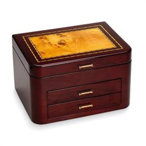 This is a magnificent, very well made Jewelry Box! It is a Burgundy Jewelry Chest that is crafted from Bubinga Wood with a High Gloss finish with Mapa Inlay on the top. This 'work of art' measures 12 x 9.5 x 7.33 and it will look wonderful in your home.