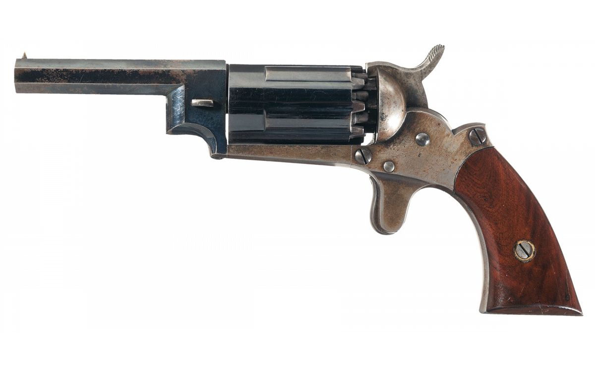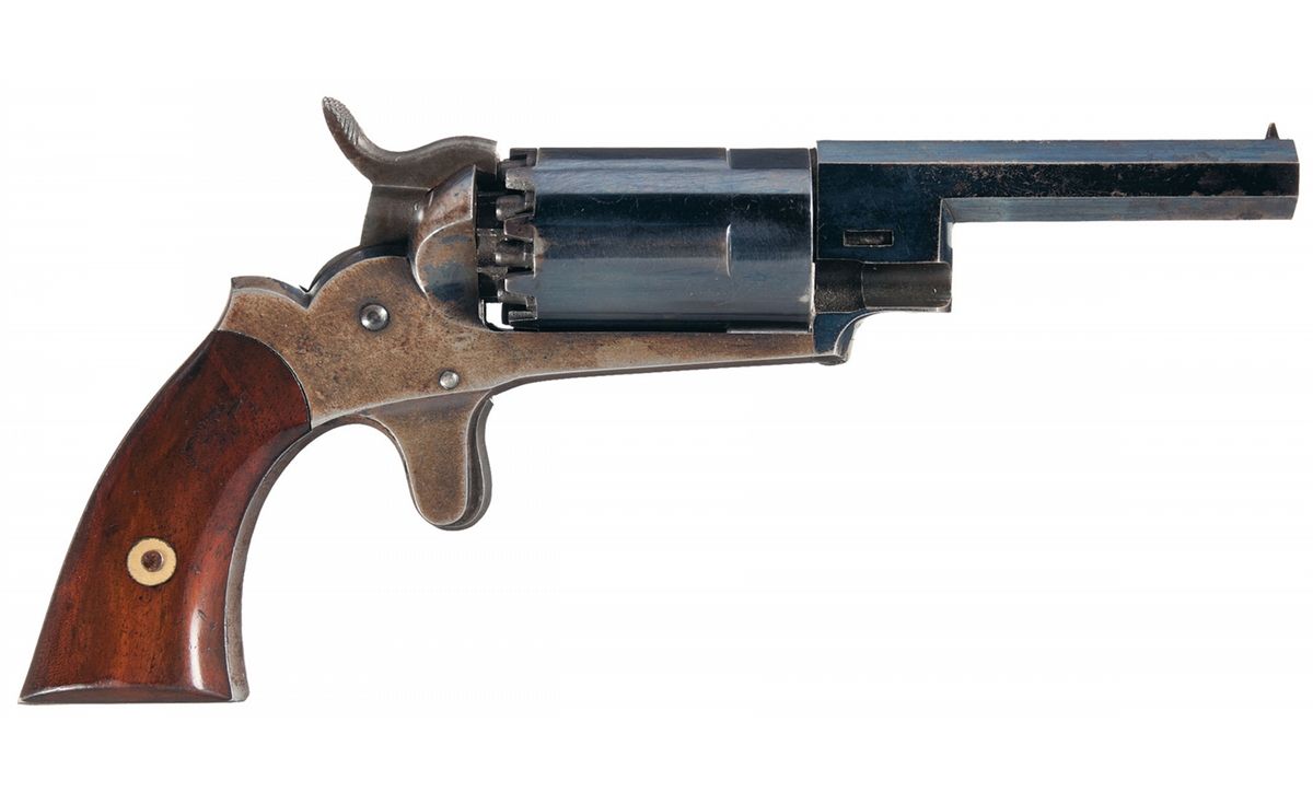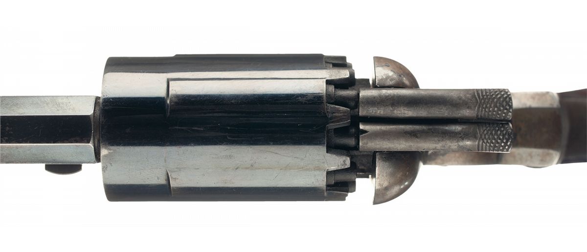 This is one of approximately 1,000 iron frame variations of the Walch Double Hammer Revolver manufactured from 1860 to 1862 for Walch and partner J.P. Lindsay by New Haven Arms Company. The grips are numbered to the gun. This scarce revolver fires ten shots from five chambers. The cylinder is twice as long so that two loads can be put in the same chamber. There is a channel leading from the front load to the right nipple and the left nipple fires directly into the rear of the chamber. When the trigger is pulled, the right hammer drops, firing the front load, the trigger must be released before it can be pulled a second time to fire the rear load. The top barrel flat has the two line New York address/1859 patent date marking. Fitted with varnished grips. It is known that some of the Walch revolvers were privately purchased and carried by Union soldiers during the Civil War.