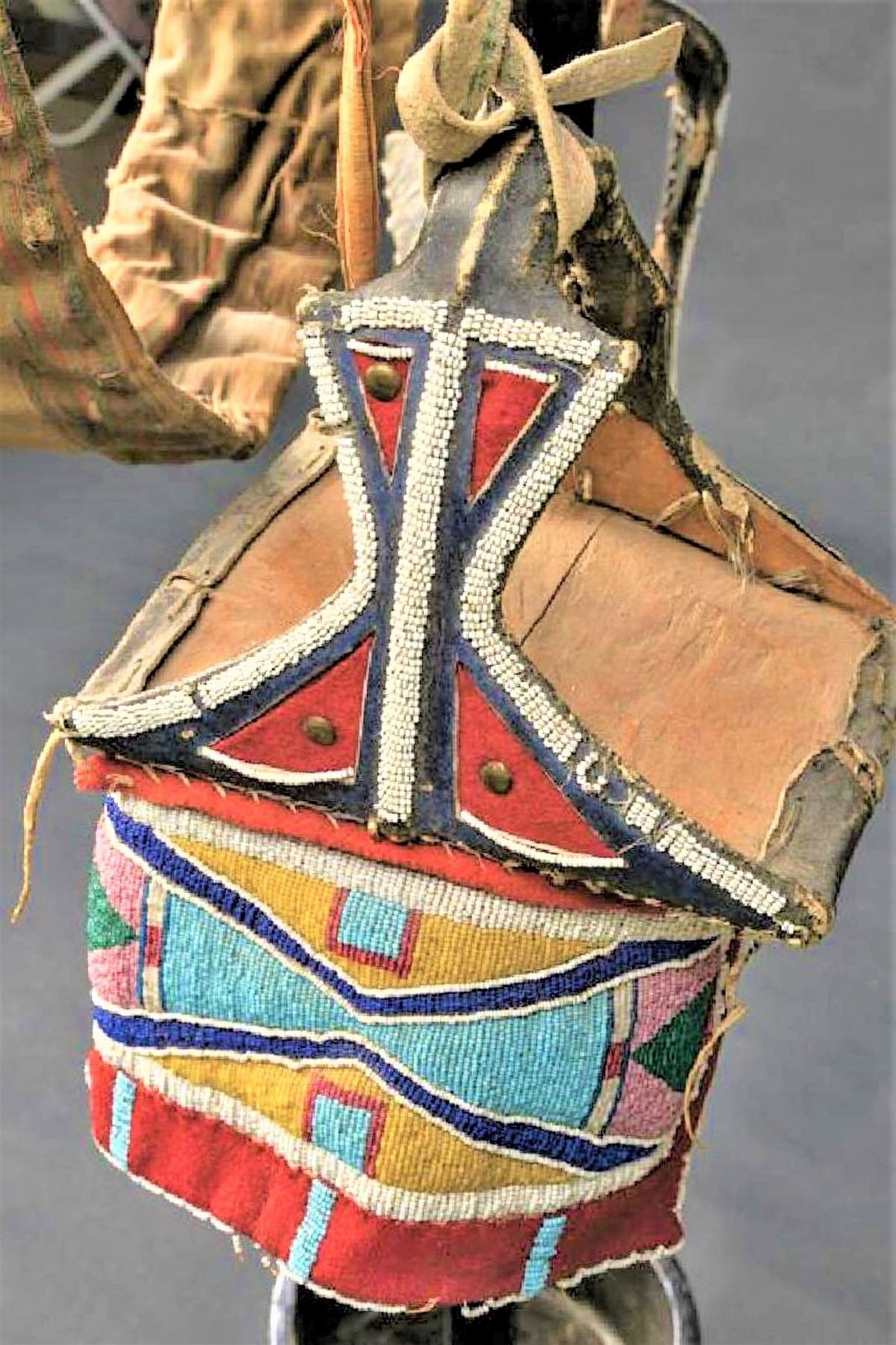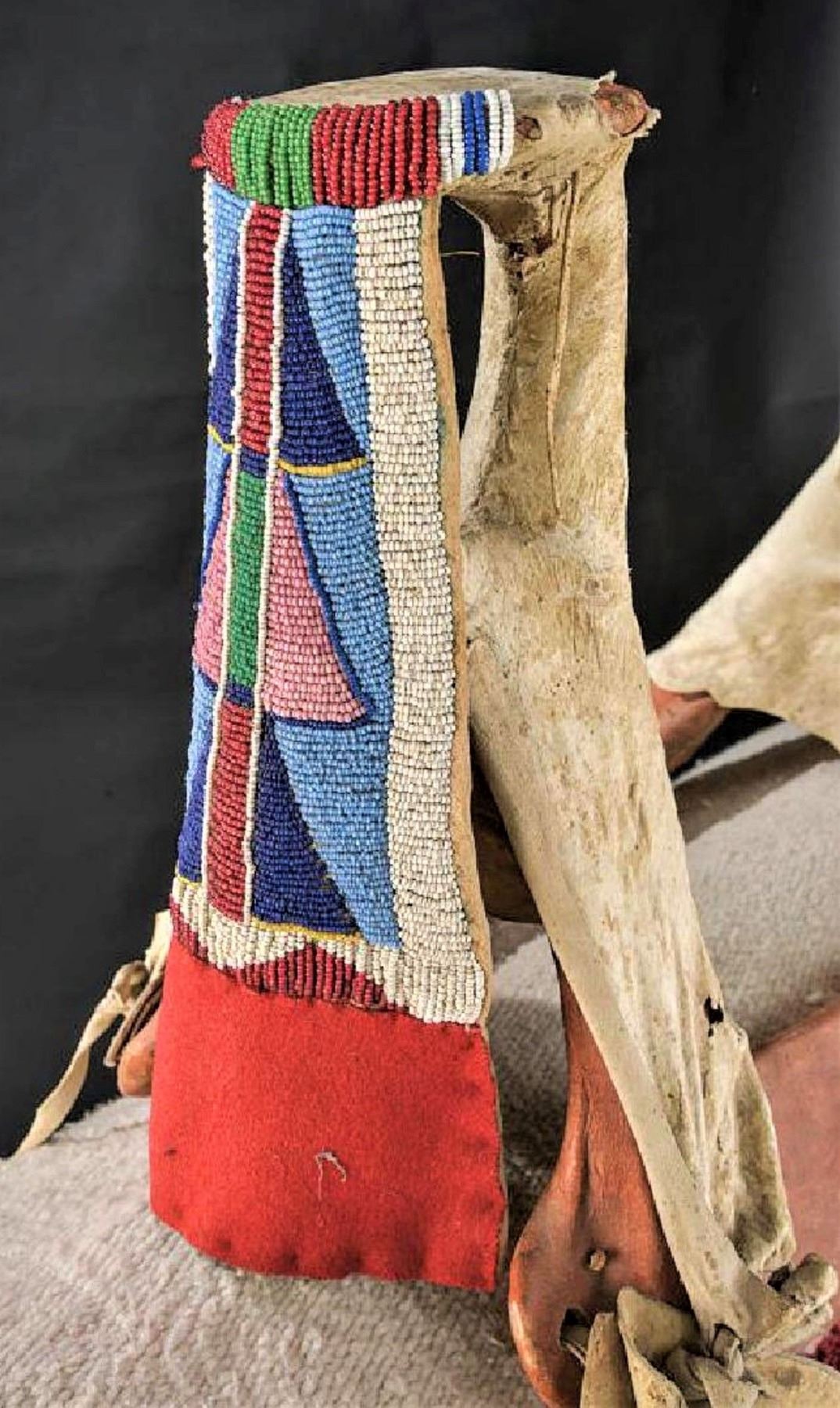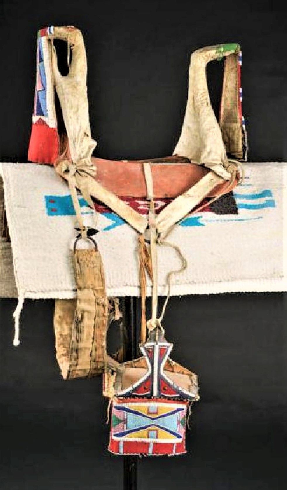 Early Crow saddle, circa 1890's, with tall hide wrapped double horned tree with long wonderfully beaded drops, it has its complete rigging and is topped off with amazing beaded stirrups.