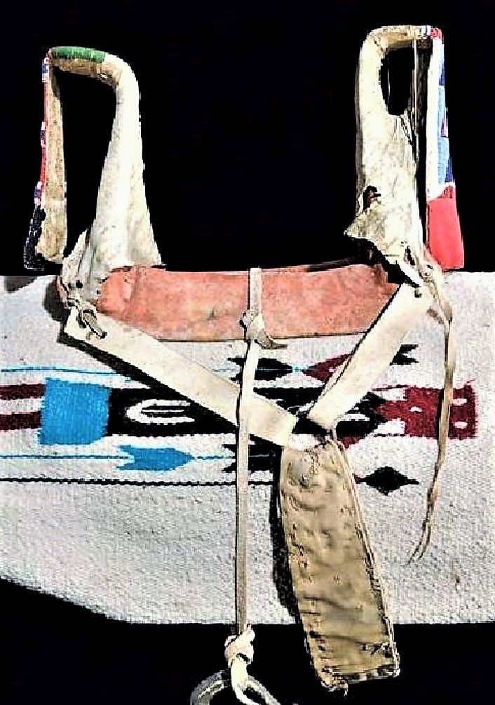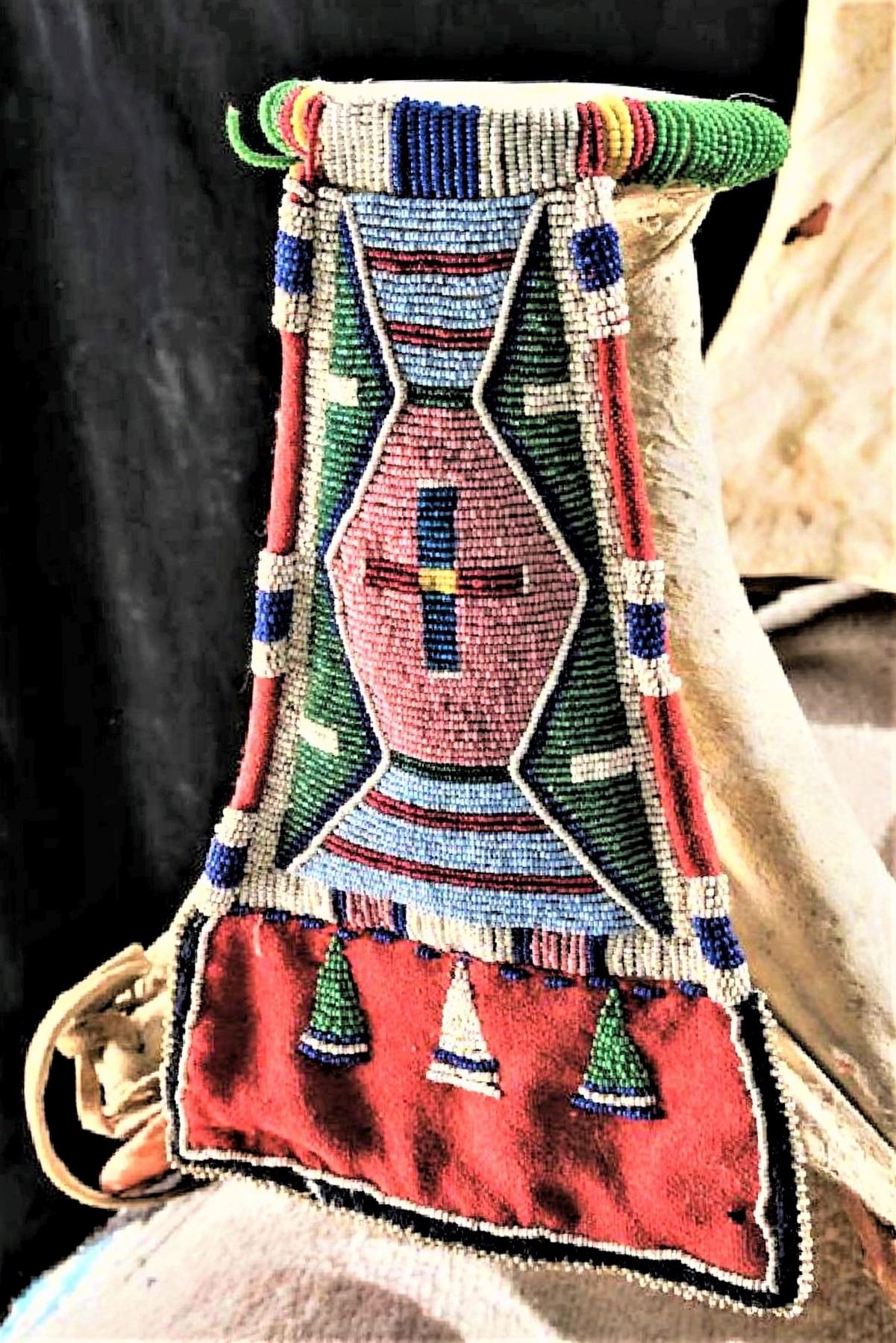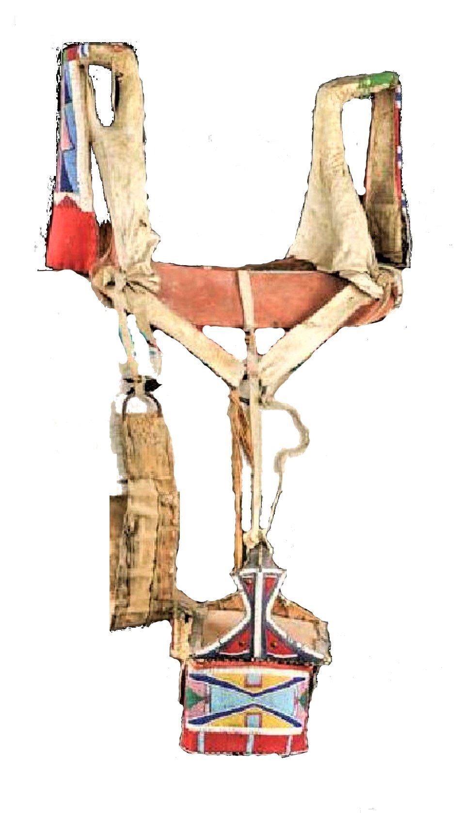 Early Crow saddle, circa 1890's, with tall hide wrapped double horned tree with long wonderfully beaded drops, it has its complete rigging and is topped off with amazing beaded stirrups.