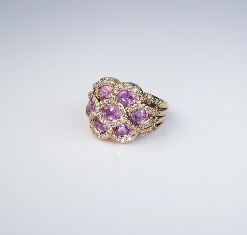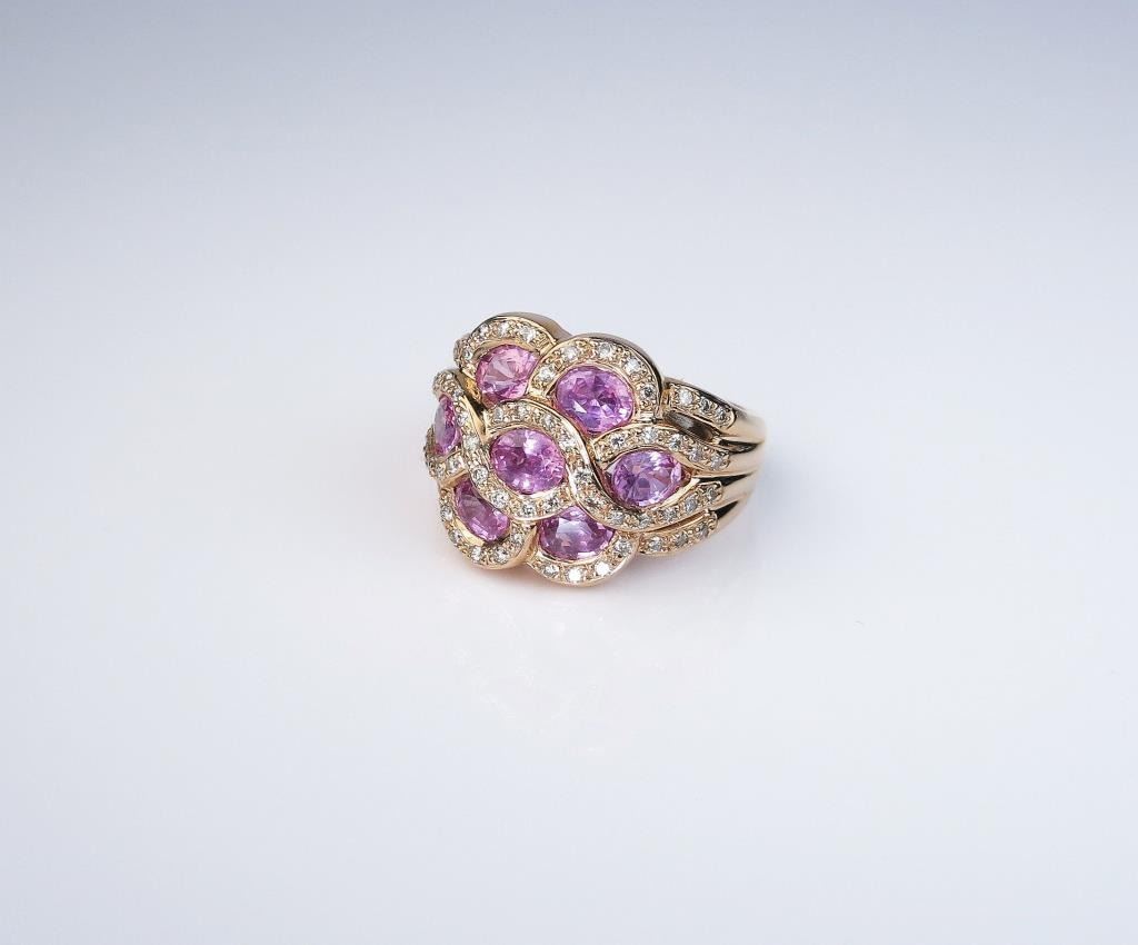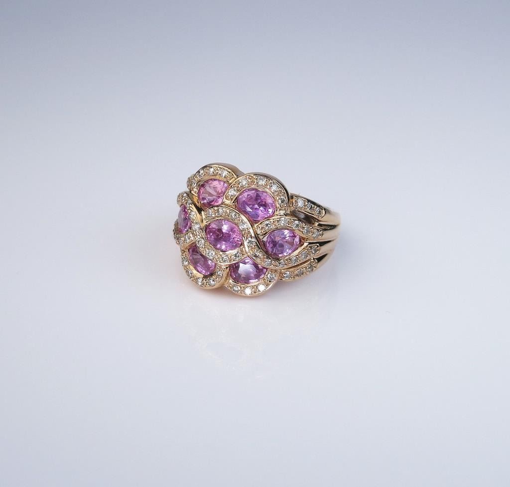 Magnificent Custom Pink Sapphire and Diamond Ring featuring 7 oval sapphires weighing 3.50-4.00 carats total intertwined with 54 round cut accent diamonds weighing 1.00 carat with H-I colors and VS clarity set in 14karat rose gold and measures 22 x 16 mm. Retail $6,000-$9,000 Estimate $3,000-$4,000